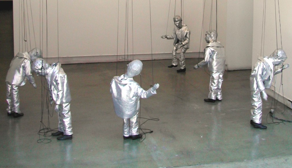 Slow Clap for Satie, 1990-98, installation with live trees, motors, fiberglass, masks, and loop of Satie piano music, dimensions variable