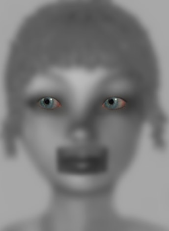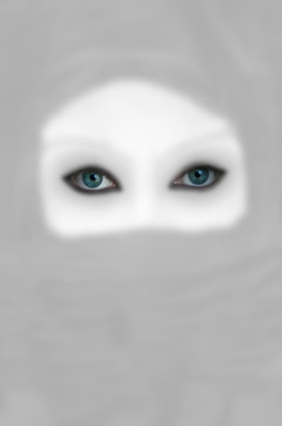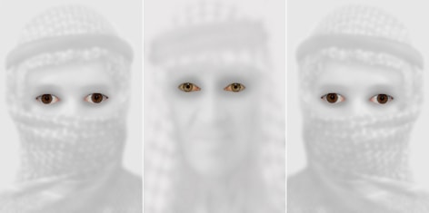 Some of the photographs Al Karim presents beneath a tautly stretched layer of silk fabric that operates as both a physical veil masking the portraits and a metaphorical filter or screen. This ’barrier’ between viewer and image can be conceived as a liminal space, a transcendental portal between being and becoming, where the mystical properties of change take place.