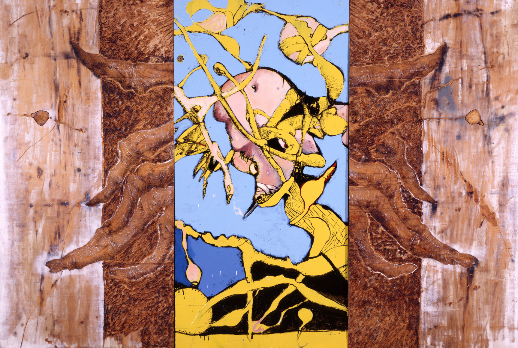 Giants and Dwarfs I (detail), 1990-2013, oil, epoxy and glass on carved and burnt plywood on two panels, 96 x 96 in (244 x 244 cm)