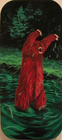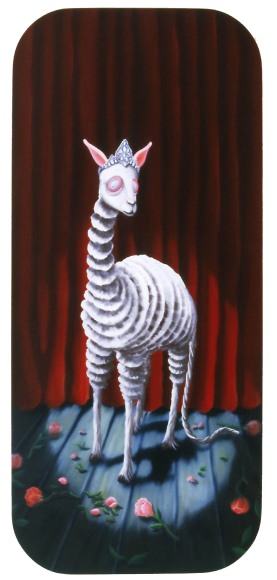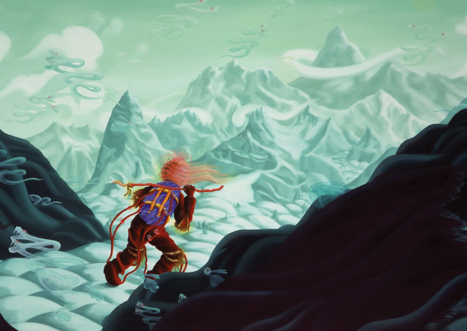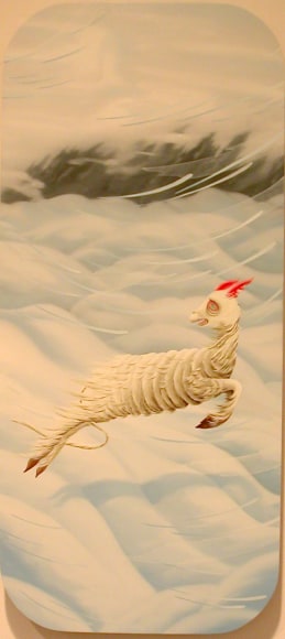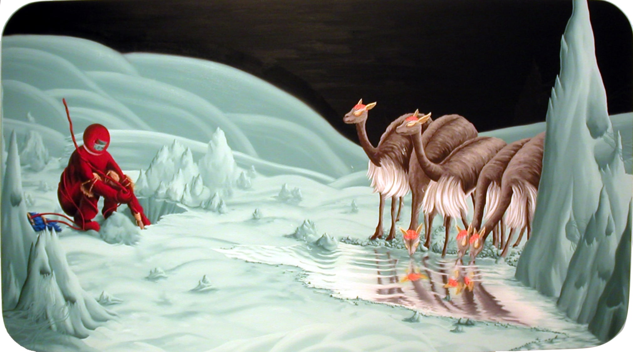 The Spaceman-Caveman character goes through extreme polarities in his drive for success: at moments he feels all-powerful, conquering the mighty mountain heights, a predator in search of his goal; in other moments, a snow storm overwhelms him and in his vulnerability he is thrust into the position of prey.  In other paintings, we see fictional hybrid animals in otherworldly landscapes . . . vulnerable deer-lambs and llamas with exposed brains are confronted by an aggressive bear and a rather frightening medieval character named the Executioner.