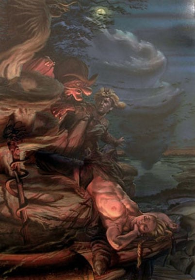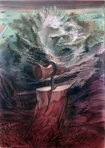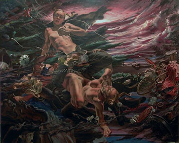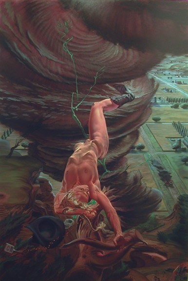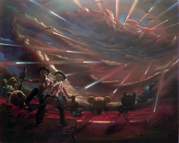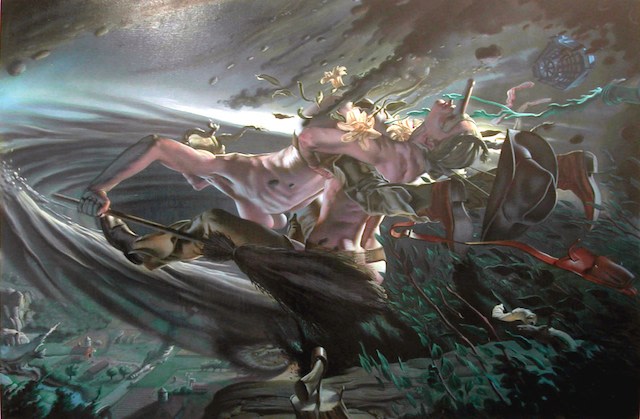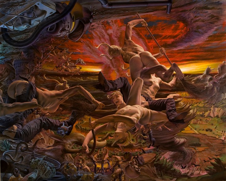 In these paintings, the artist attempts to realize the “unreal” in his use of mythical references. Utilizing witches to explore the depths of sexuality, mysticism and power, the paintings are composed as conceptual cinematic storyboards and tell a story from multiple points of view. Invoking, at times, sexually explicit subject matter, the artist, who looks to a wide range of popular culture sources for visual inspiration including high-tech “first-person shooter” video gaming, renders a seemingly post-apocalyptic view of American society.