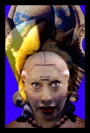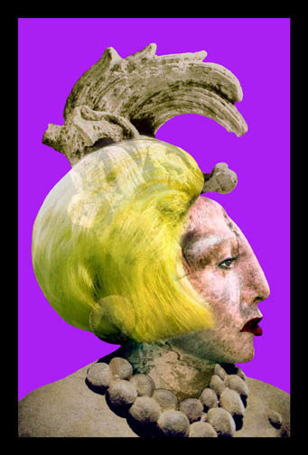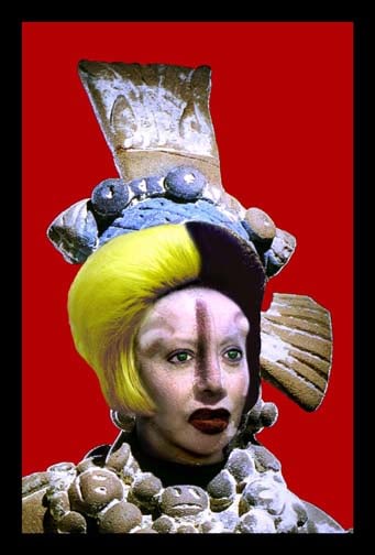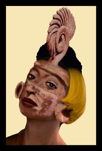 combining Pre-Columbian and African icons with her own image; the resulting hybridizations create a