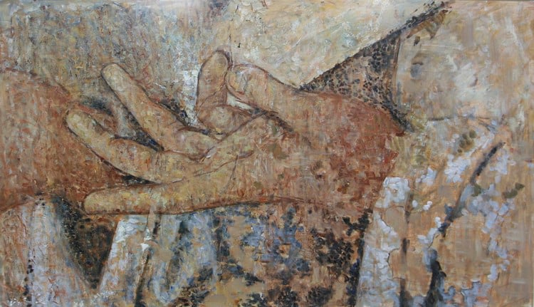 The Hands, The Last Supper Series, 2002, Oil on silk tissue paper, 10.5 x 18.5 in (27 x 47 cm)