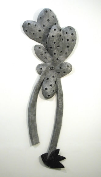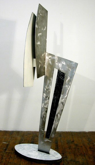 Ben-Haim’s sculptures explore some of the same graphic, archetypal imagery, again in flattened planes of aluminum, but here welded into self-supporting, almost figurative presences. Zigi began this most recent series of work in the aftermath of September 11, inspired by the enormity of the reconstruction project. It is almost as though from the wildly heterogenous rubble of the twin towers, he has pulled any number of recognizable objects and images, assembling them into a new, erect being – an image of the will to continue, to pick up what he can to imaginatively press on, as indomitable as the ants who fascinate him.