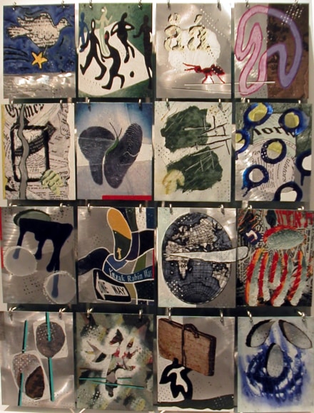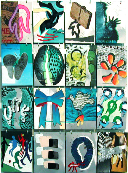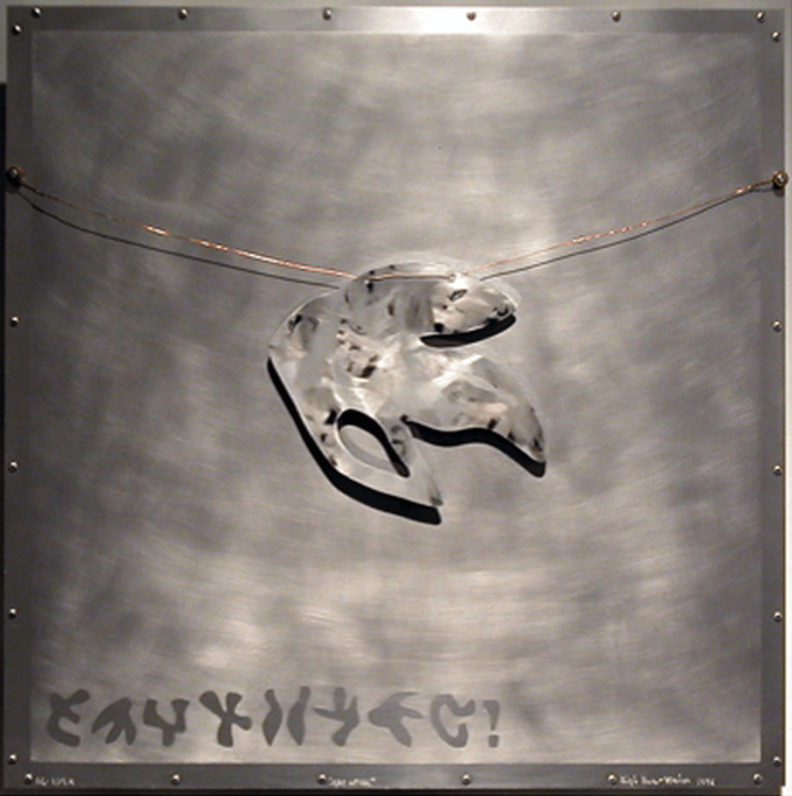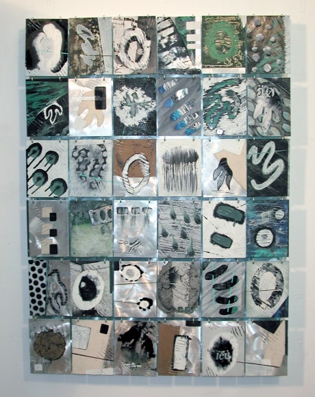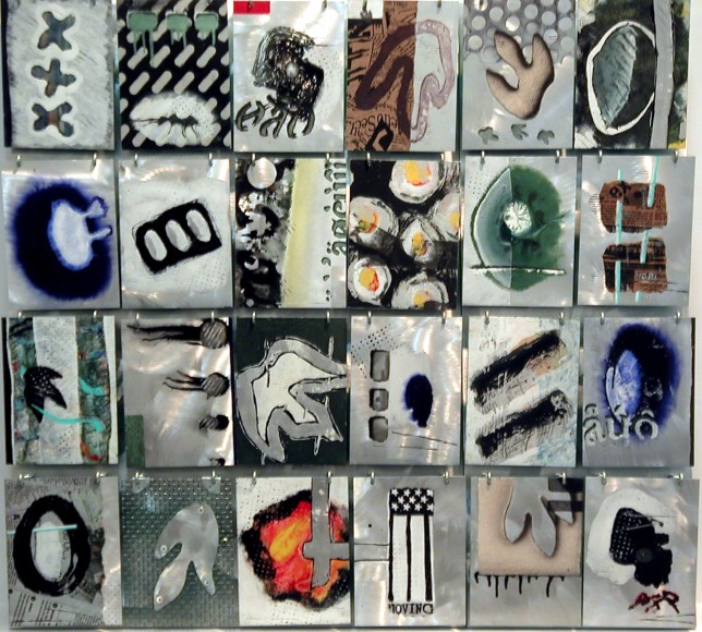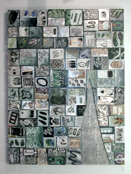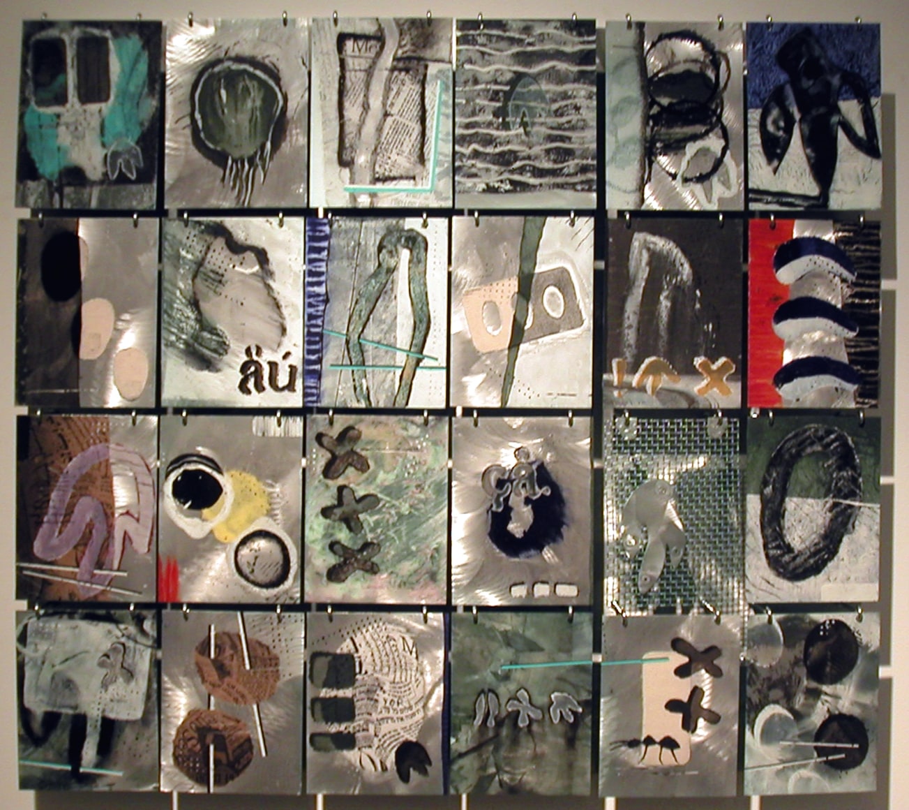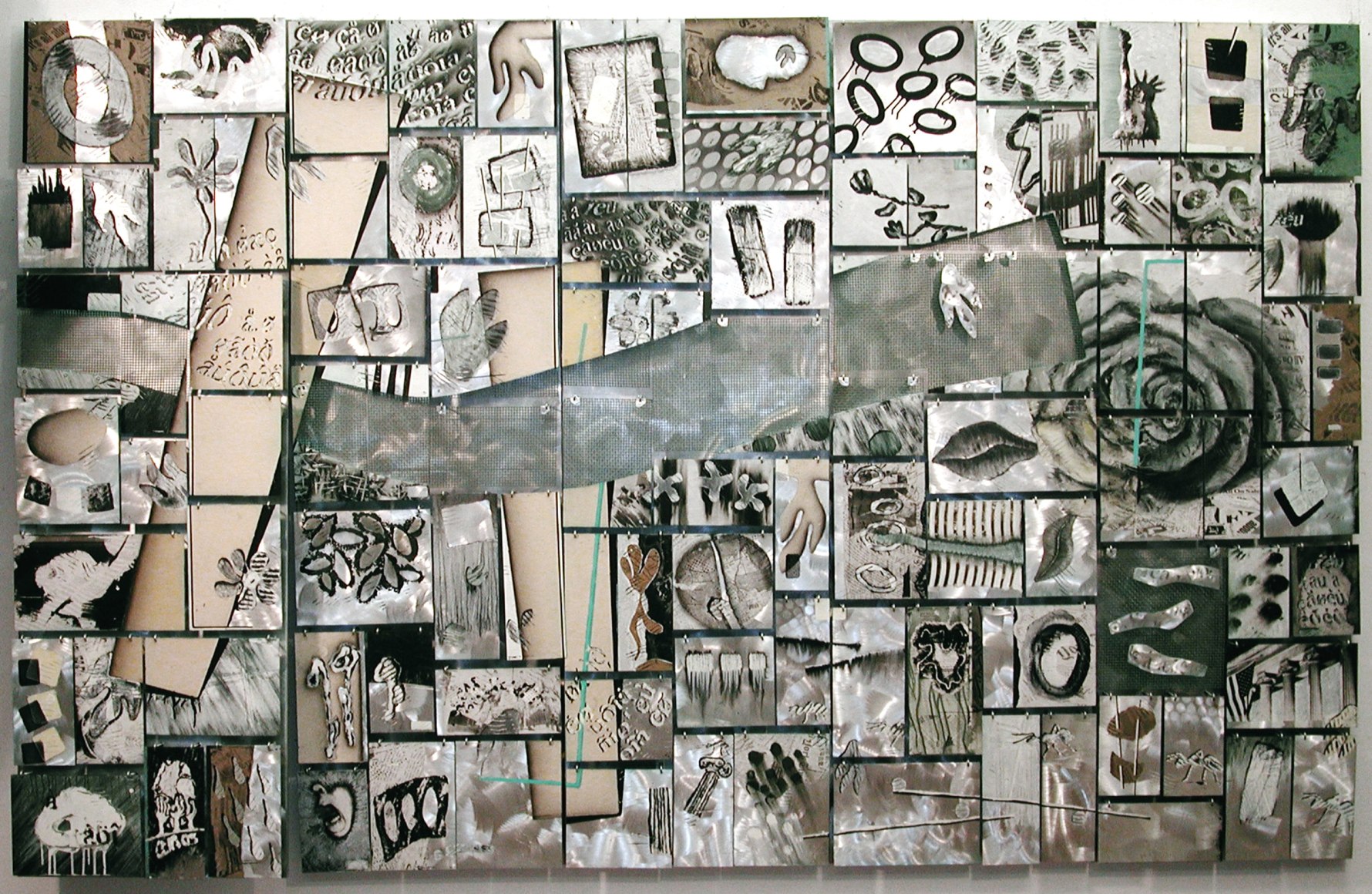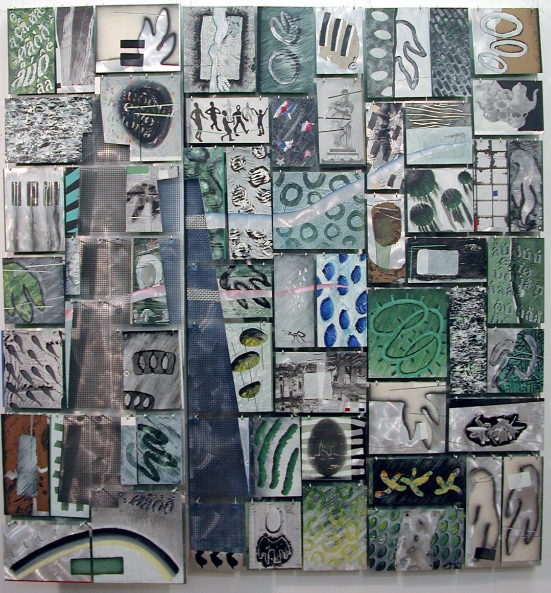 Sorting through the many layers of resonant images, language, and the whole network of meaning in which we all live, Ben-Haim repeats several personally and symbolically significant schemata – the leaf, the oval, the brick, and the ant – across rows of aluminum tiles or plaques, hung together in grids. Here and there other photo-silkscreen images, abstract forms and fragments of language serve to reconnect these almost timeless, archetypal objects to the ebb and flow of contemporary life. The repetitive, manufactured aura of the metal rectangles is gently but insistently contrasted with the personal, handmade aesthetic of their painted imagery. Again, Ben-Haim locates the contradictory nexus between the anonymity of mass production and the everyday familiarity of the objects so produced, calling us to a new awareness of the conditions of contemporary experience.
