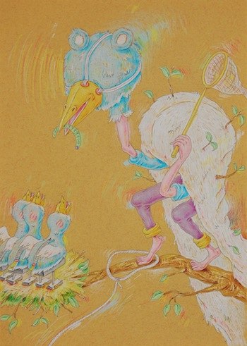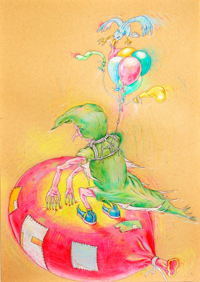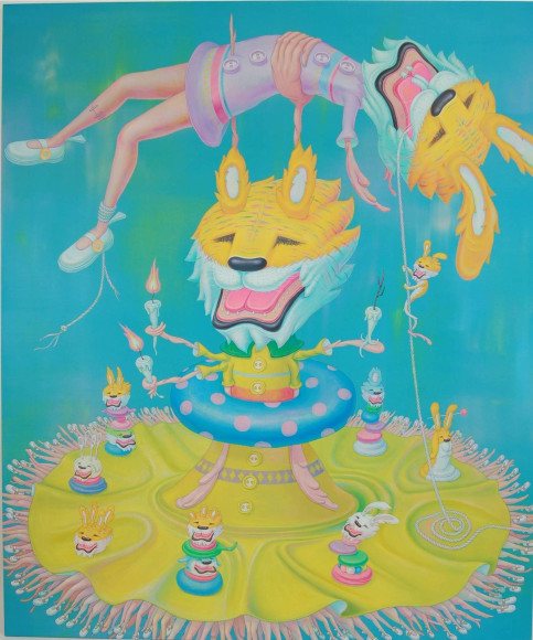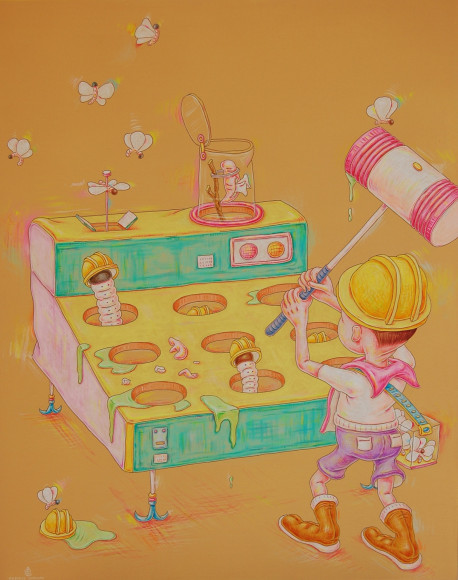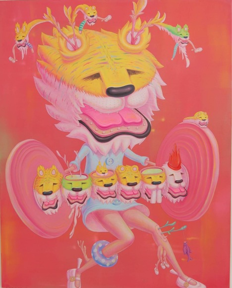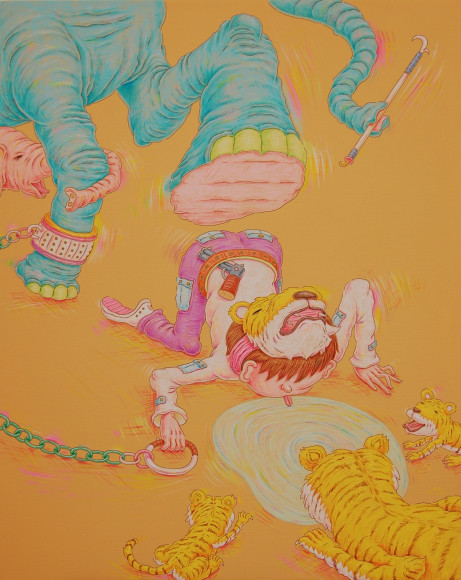 Japanese artist Akikazu Iwamoto creates wildly imaginative, candy-colored paintings and drawings that offer confronting, amusing, and sometimes frightening revelations of our inflated inner desires in their most distilled state.