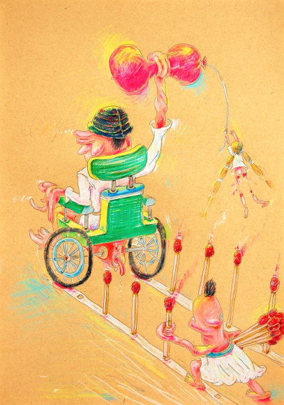 His vast portfolio of drawings further showcases his powerful imagination, and sheds light on his enigmatic compositional processes. Delicately rendered with pastels and colored pencils, these images offer spontaneous, experimental, stand-alone frames that, in their totality, form a panorama of his mental kingdom. They often emanate a sense of mystery that supplements the excitement and energy of his canvases. Their sketchbook-like quality inserts a reporter’s notebook kind of sensibility that makes these jarring, candid scenes from his psychological landscape simultaneously personable and haunting.