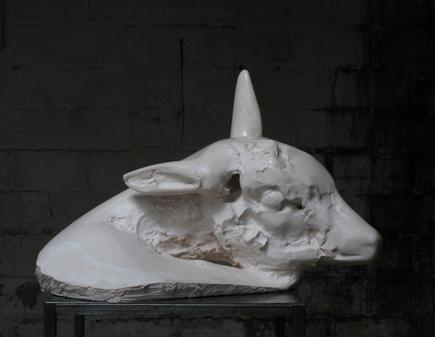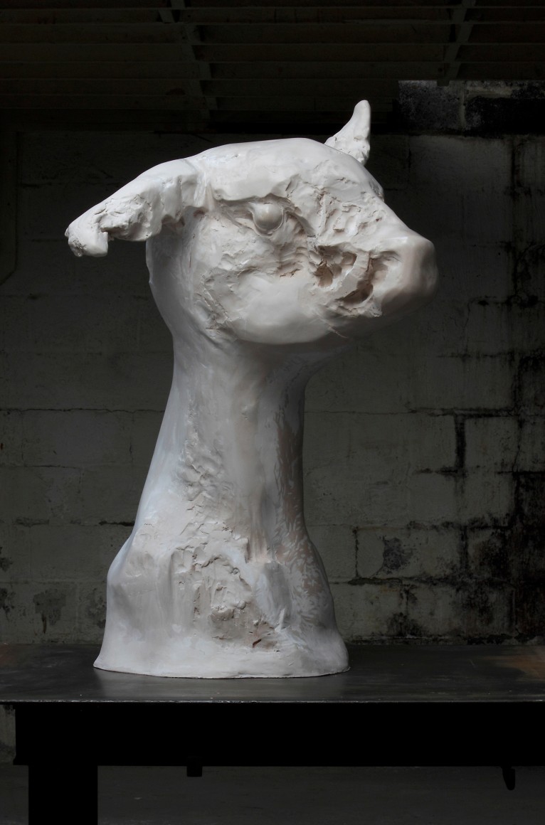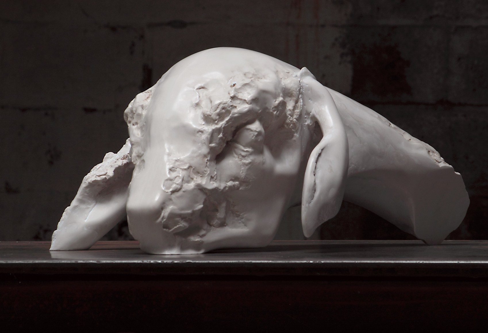 His “Lambs” series of aqua-resin lamb heads are docile, stately and gently mysterious. The lamb heads are not busts, but rather cropped sections that still carry an imaginary presence of the entire body. The pristine color and smoothness of the medium evoke classical tenets and a sense of timelessness, accentuating their fleeting innocence and our current societyʼs long departure from classical idealism.