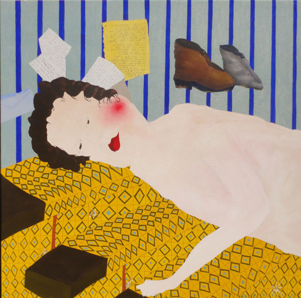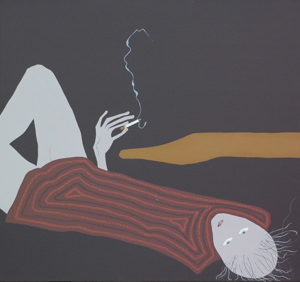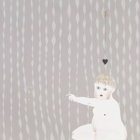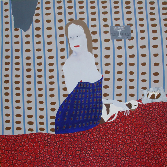Influences range from Egon Schiele to Elizabeth Peyton, geometric abstraction, Op art, minimalism, expressionism, folk art, and outsider art. Out of flat planes and shapes comes vivid color that punctuates the existential narrative. Adalsteinsdottir paints in an ultra flat manner with carefully nursed details, interrupted by repetitive freehand patterns and unexpected pops of eccentric textures. Even though her paintings achieve extremely cohesive rhythms in composition, Adalsteinsdottir does not work from sketches, and this raw spontaneity clashes wonderfully with the refinement of her controlled execution.
