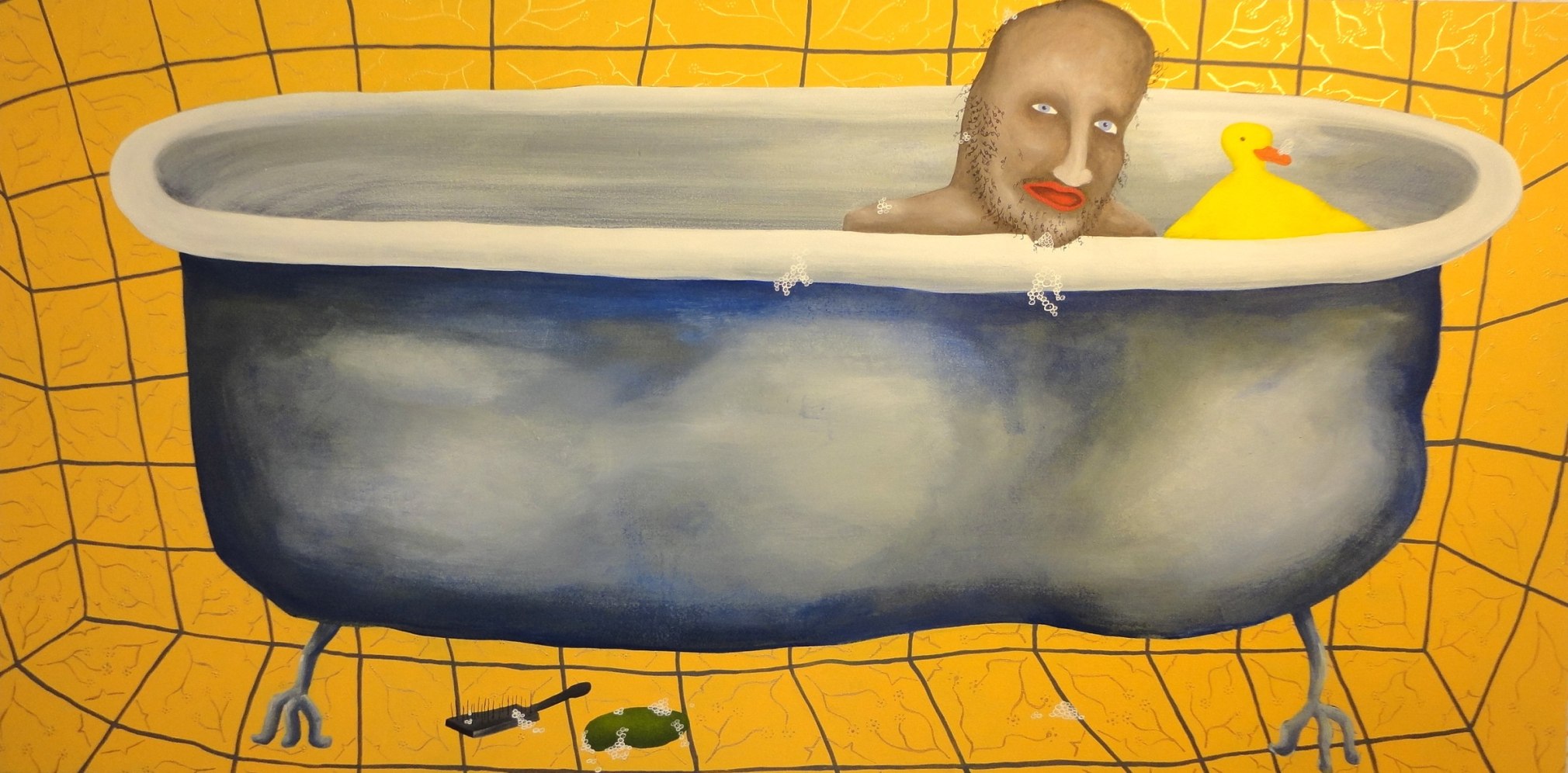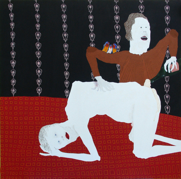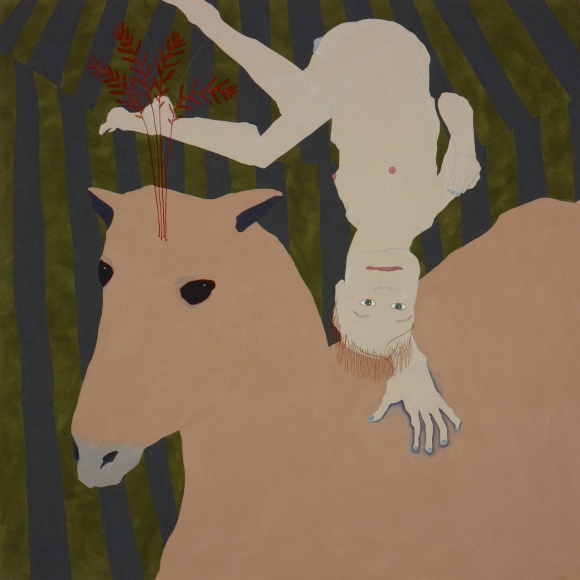 Eccentricity distinguishes her work, peculiarly portraying the symbolic relationship between human, plant and animal life. Her male and female protagonists are androgynously painted in a near crude physicality with loose stringy strands of hair, knobby limbs, and contemporary modish clothing that often float in space.