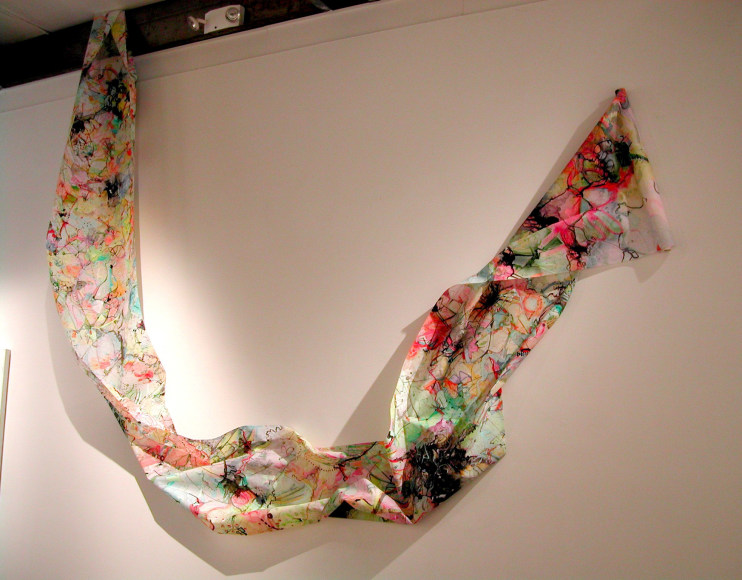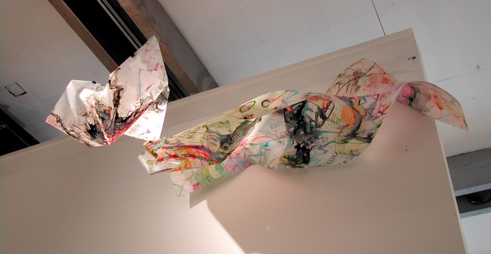 Anna’s new three-dimensional installations – paintings on mylar, are site-specific. She explains her relationship to space: “I am learning as I go… It is both thrilling and scary -- … I approach this problem as a painter, I try to see the space as a painting, try to imagine things in a space like they would fit into a painting.” In this context, her work finds friendly company in the works of artists she admires such as Richard Tuttle, Sarah Sze, Kara Walker, and Mary Heilmann, among others. Apart from formal investigations, these works are meant to be viewed within a loose concept of metaphorical narrative. The title of the whole exhibition, “priest chews velvet haddock,” reveals Anna’s keen interest in evoking surrealist use of language. Her title refers to fragments of thoughts as equivalent to sounds and partial images. The viewer is trusted to “fill in” and make his or her own meaning. Seen as a whole, on canvas, objects, and installations, Anna’s painting is intuitive and process-oriented, always revealing distinct open-endedness.