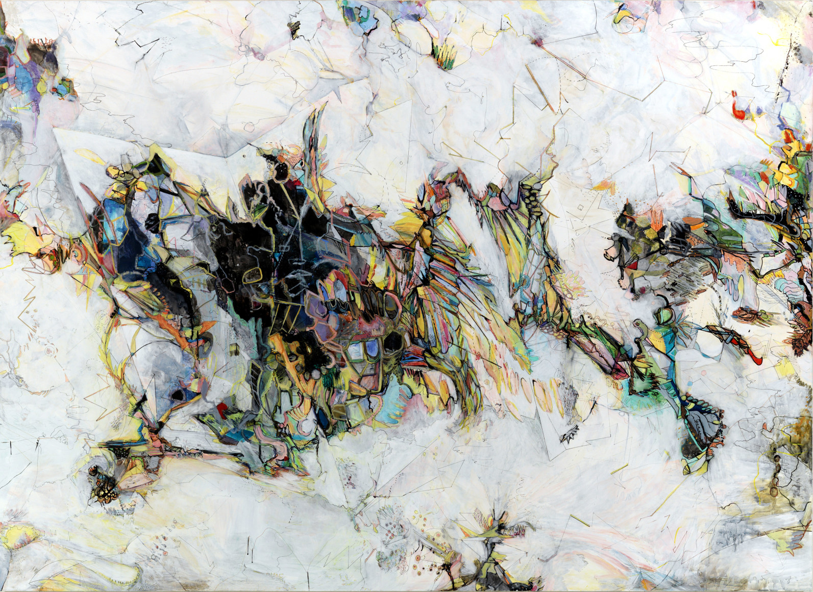 chaos/ no way near, 2009, Acrylic and ink on canvas on wood, 47 x 65 in, 119 x 165 cm