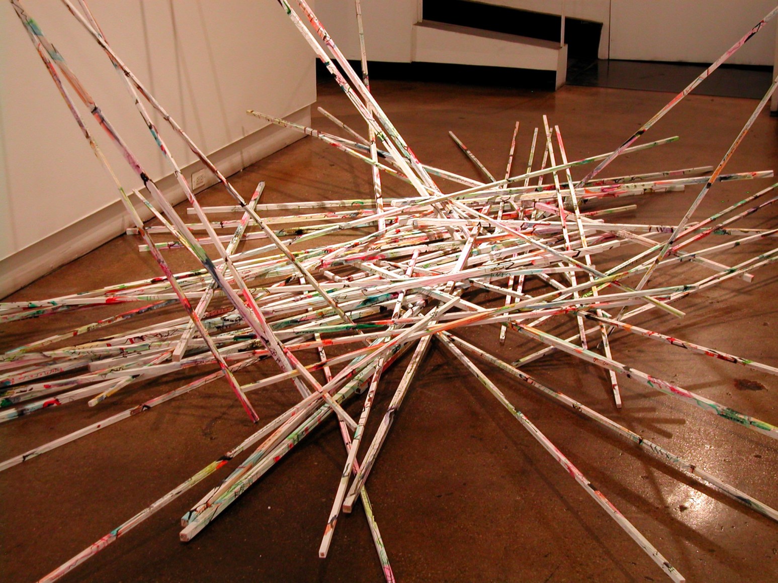 Stux Gallery is pleased to present the second solo exhibition of installations, paintings and drawings by Icelandic artist, Anna Jóelsdóttir. This exhibit is accompanied by an illustrated catalogue with an interview by New York art historian Jovana Stokic. Jóelsdóttir’s new body of work reflects her refusal to stay in one place. As she goes back and forth between Iceland and the United States, she also moves beyond her historic use of the canvas. In her idiosyncratic approach to objects such as sticks or diaries or big three-dimensional installations, one can always trace her closeness to the logic of painting.  The artist’s previous series of paintings speak eloquently about this ongoing dialogue within the language of abstract forms that are always somehow related to the logic of representation. The new series of paintings entitled “chaos” let the artist tear down or build up forms that are always in a flux. At the same time, her meticulously painted sticks show her idiosyncratic way of solving the dichotomy between hard-edge geometry and her curvilinear abstraction.