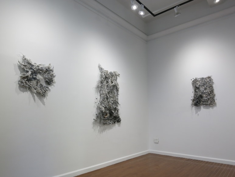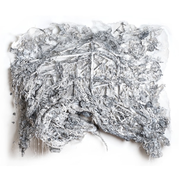 Melamed's work is born equally through construction and destruction. Wearing a gas mask at work, she fuses together layers of transparency film, drawings, photographs and mesh with a burning torch; then, using a razor, she delicately feathers the welded object and grants it life and lightness. Her compilation of visual information distances the work from reality without losing reference to the present and past urban world. Though no color is deliberately applied, her methods of adherence bring brilliantly nuanced warm and cool hues to light, blossoming past the barbed surface like flower buds through concrete. Hope and devastation simultaneously arise from her works, as well as thoughts about the environment in which conflict amongst civilizations and industrial progress thrives together.