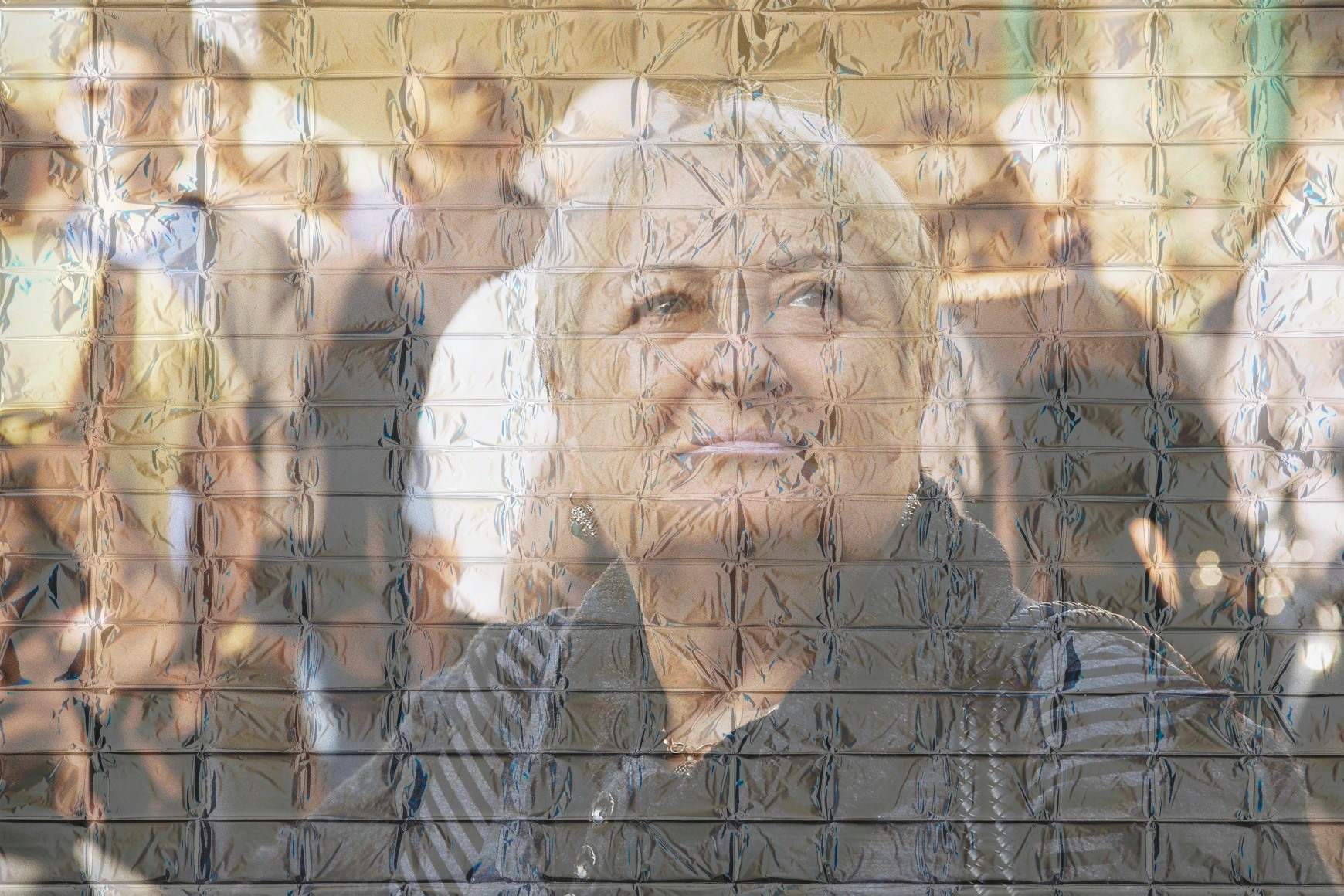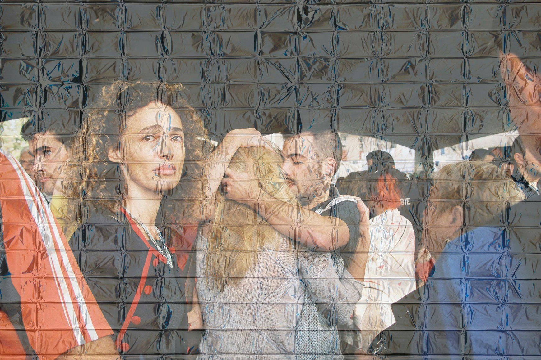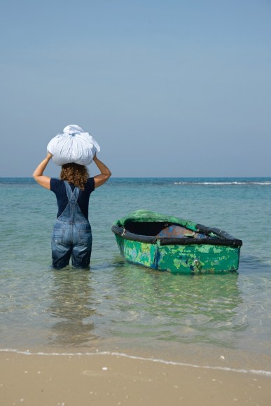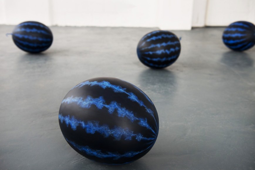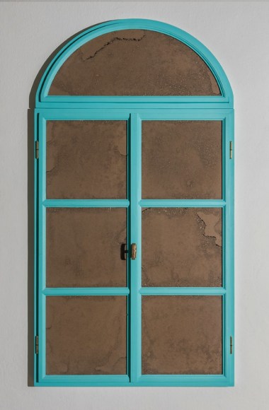 A new series of photo works, printed on glossy aluminum, will surround and exist in dialogue with Naorʼs newest sculpture. Scenes of people bidding farewell, awaiting unknown futures, are overlaid on the life-preserving surface of a thermal emergency blanket. The thin foil (developed by NASA), coated silver on one side and gold on the other, calls to mind images of the survivors of the Paris terror attack and the waves of refugees in Europe. Completing this new series is a selection of works from her 2012 and 2015 solo exhibitions in New York City. A window obscured by earth greets one at the door, beside Naorʼs monumental worry beads hanging stoically next to a gurgling sink, surrounded by her Tigris River blue melon sculptures perched on the floor.