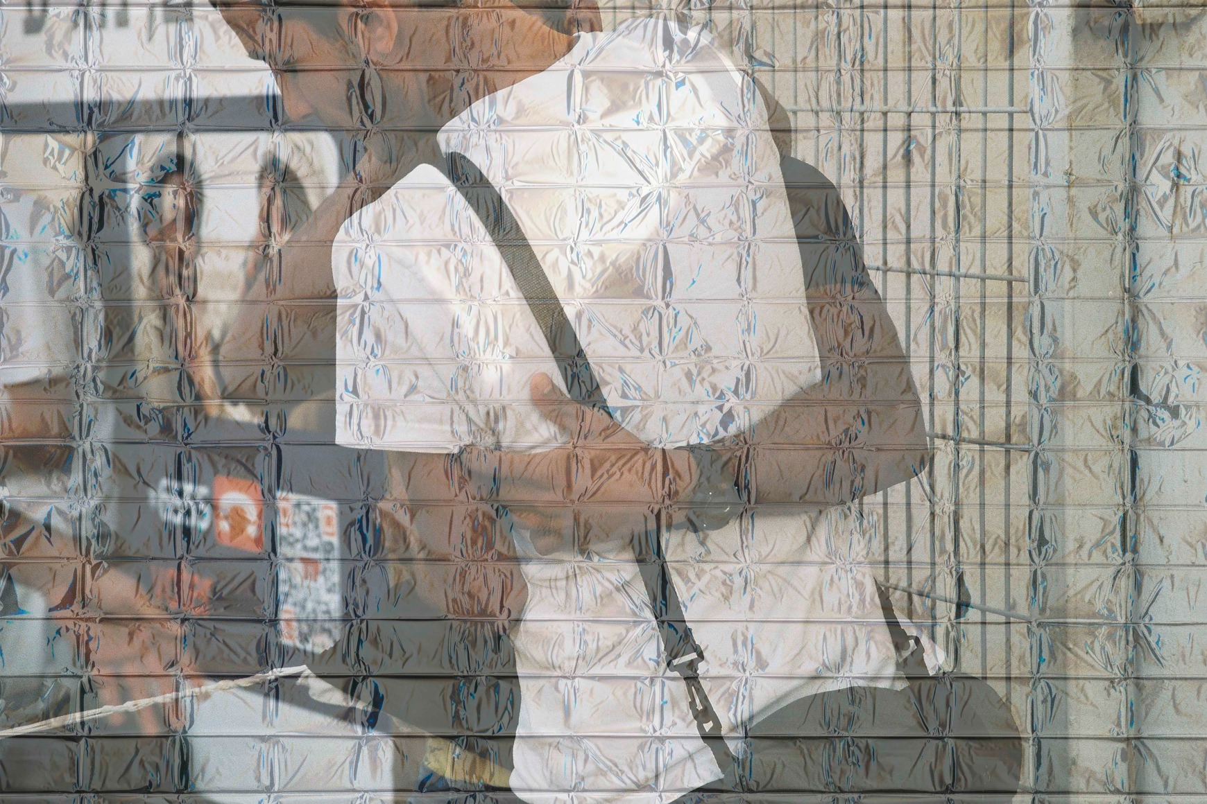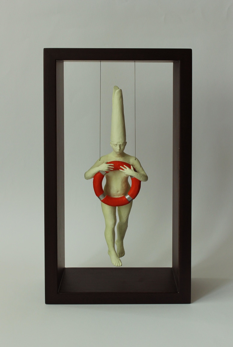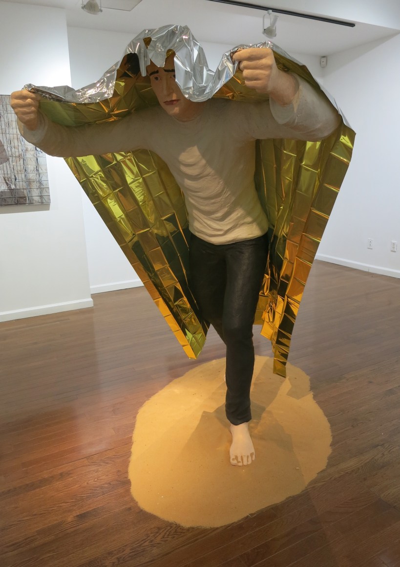 Central to this exhibition is a life-sized sculpture inspired by the figure in Goya's 1798 painting "Witchesʼ Flight.” The thermal emergency blanket yet again cloaks a man, hunched, fleeing...the blanket here in three dimensions, serving its true purpose: protection, warding off the specter of fear. The man lurches forward, frozen in his perpetual movement and ordinary clothes, an energy preserved in his body and tense, nervous face.