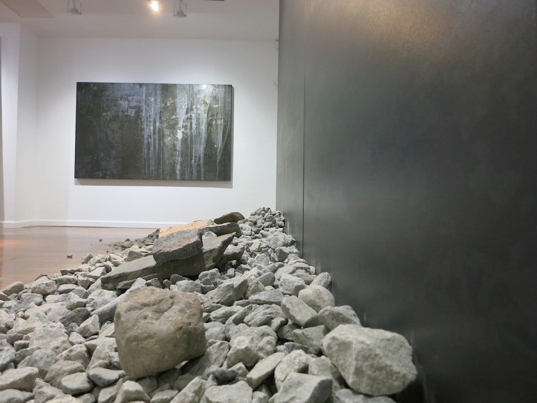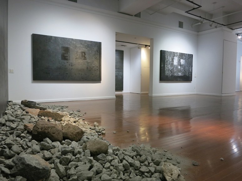 Hezron, a towering digital print on canvas with granite, is the centerpiece of this exhibition. It is a deafening silence physically expressed. Five panels hang on the wall before us, quiet and dignified. Decades after combat, Lemayʼs wartime experiences in Lebanon lurk behind a veil of viscerally rendered grey and black. Our minds, aided by the tactile granite at our feet, transport us to the incessant anxiety of discerning surroundings in the dead of night.