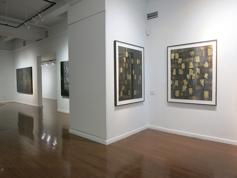 Two new series of works, AU and OR, done in charcoal, ink, and gold leaf on canvas or paper, complete the exhibition. These stoic objects seem to flicker, the gold leaf alternately jagged and crisp. Lemay alters the meaning of light in the darkness - so often a hopeful image. Instead, these layers of gold and shades of black are visually arresting yet vaguely unsettling markers of the splintering effects of memory and loss in a horizon of sparkling opposition.