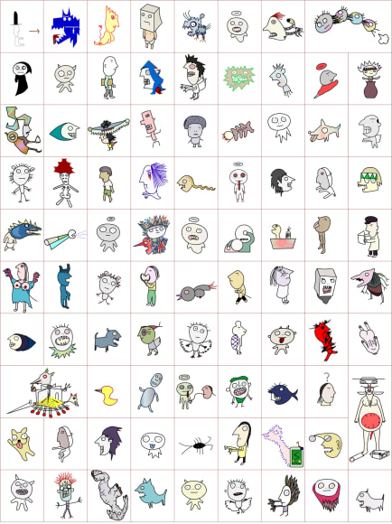 All of the works are originally created by hand on paper and/or canvas. Select images are then “re-drawn” on the computer and executed as archival digital prints, animations books, or installations.    The works as a whole are temporal, in constant motion, and hint at a larger ubiquitous nether-world full of mutated citizens, some half animal, half human (or some other ungodly combination of beings) constantly mutating, making love, eating, defecating, killing, or simply stuck moving in endless circles for eternity.