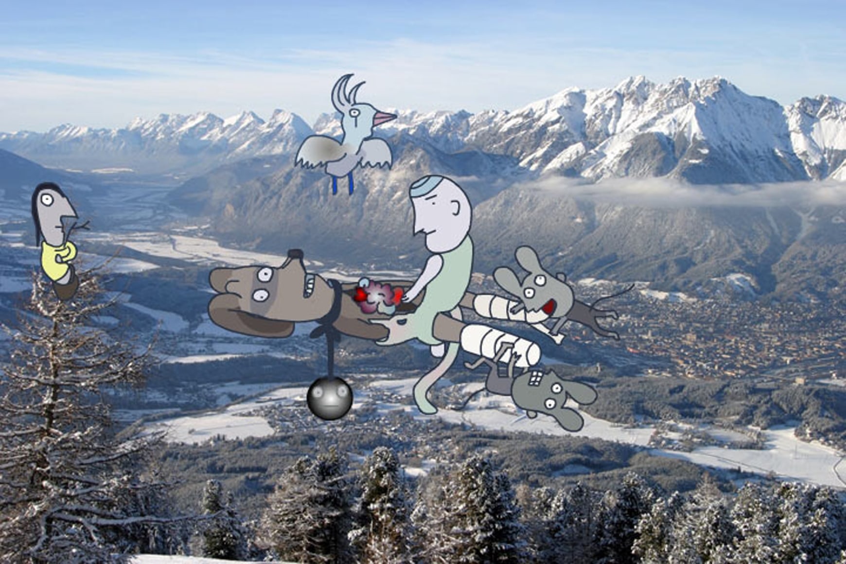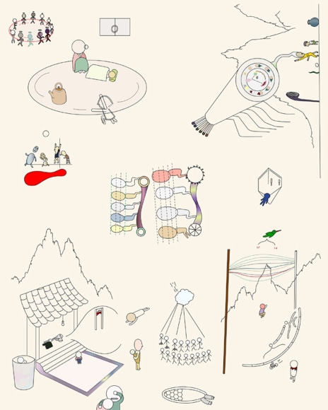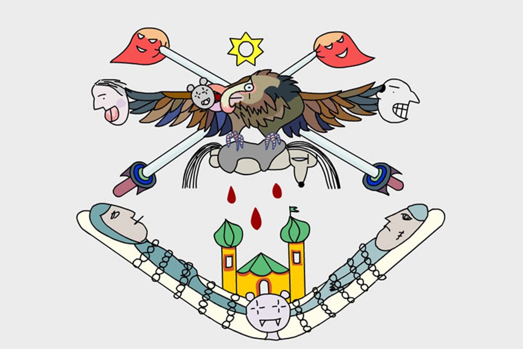 Utilizing free association and stream of consciousness, Hwang’s work assumes the iconography of the locales she frequents. During a recent residency in Innsbruck, Austria located near the Austrian Alps, her animated film, Bestial Delights, 2005, incorporates the crests of Royal families that adorn the castles populating the area. Hwang unleashes her characters on these impassive and stoic icons, turning them into what looks like quasi medieval torture apparatus filled with regurgitating monsters and little children impaled by gigantic swords.