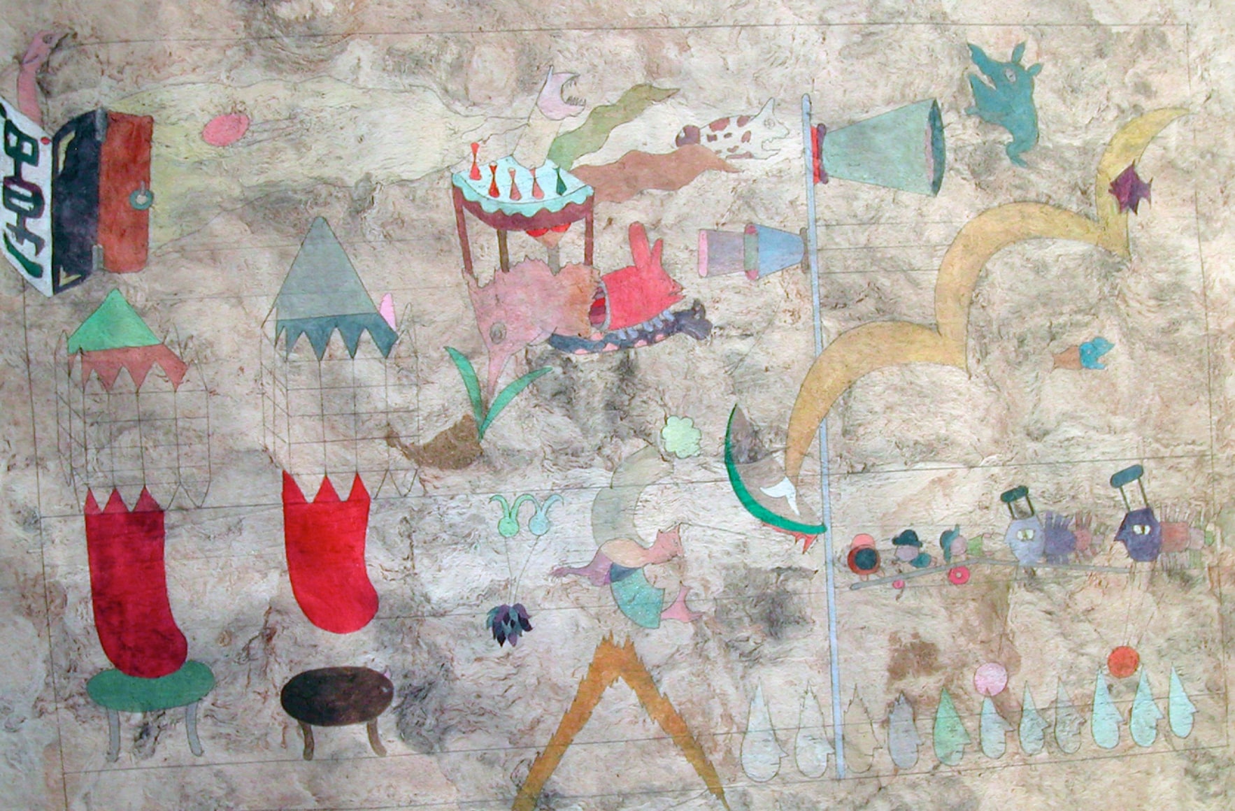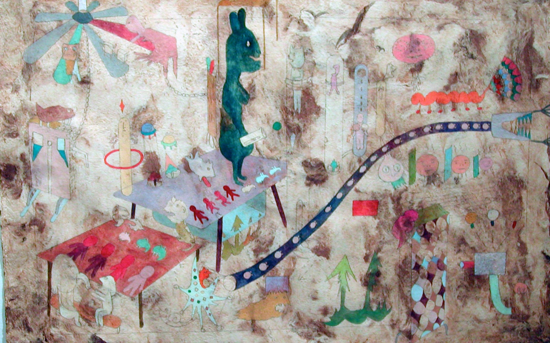 Future Creatures #6, 2005, gauche and acrylic and bark paper, 15 x 23 in (38 x 58.5 cm)