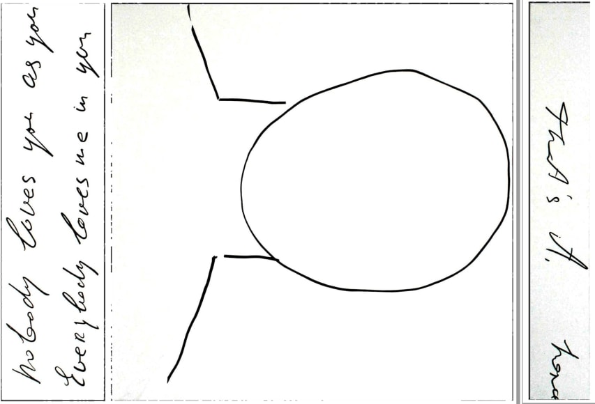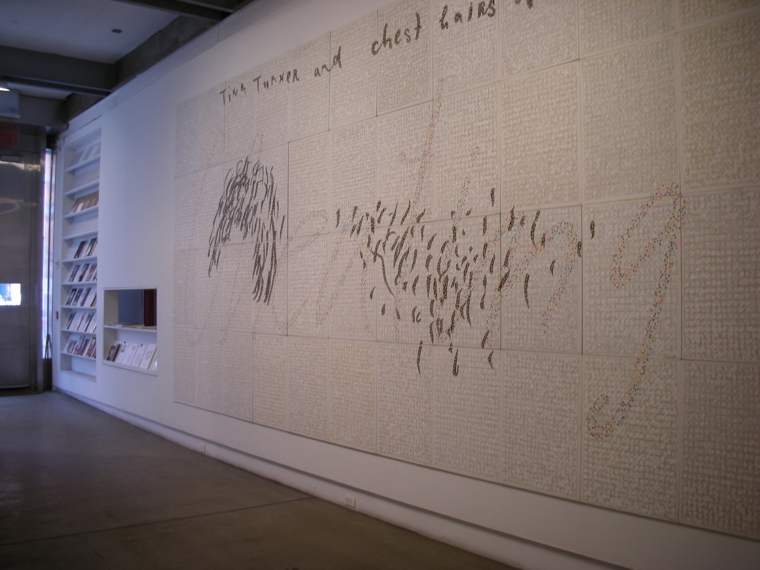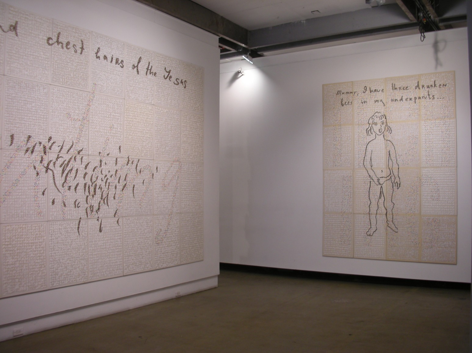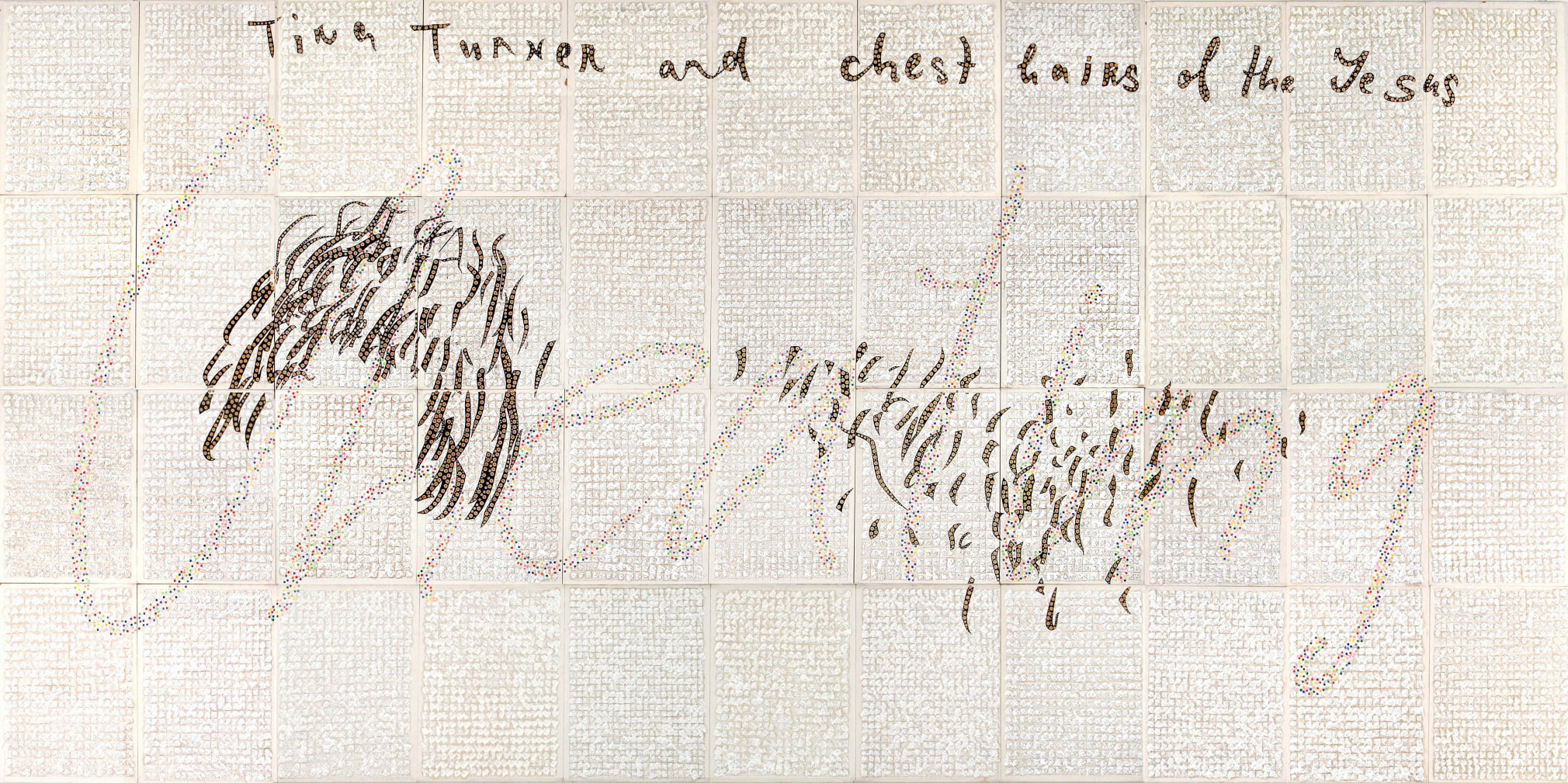 Forming the bulk of the exhibition, on view at STUX Gallery are large-scale paintings the artist created by projecting small hand-drawn sketches on canvases and painstakingly reproducing each enlarged copy. Completing a short circuit between drawing and painting via mechanical reproduction, stylistically the sketches invoke the calligraphy used in Georgian script, while the sparse composition points to the work of the Russian Constructivists or Conceptual art. Often underscored by a fragment of text, these paintings depict objects and figures ranging from the quotidian to the uncanny, each rendered in (a copy of) Edzgveradze’s unique gestural hand. Part of the series, Tina Turner and the Chest Hairs of the Jesus (2005), for example, nominally plays upon two senses of “icon” (holy and pop diva), while adding pencil and confetti to the surface of the canvas.