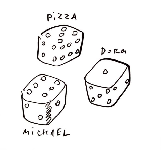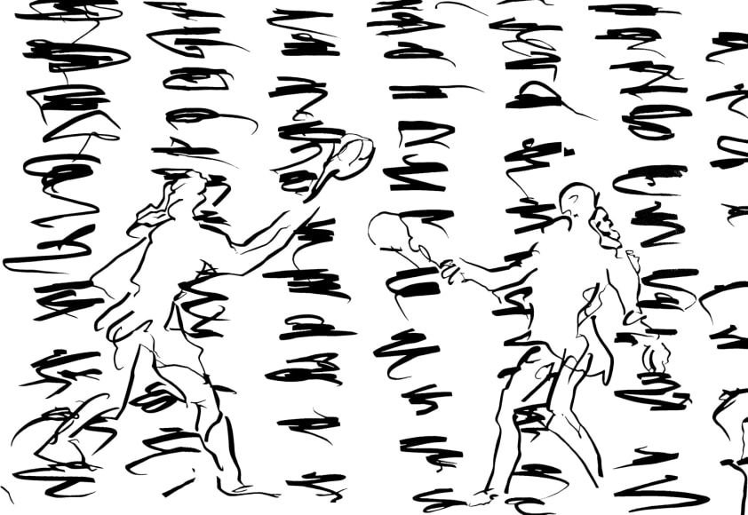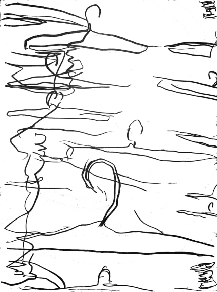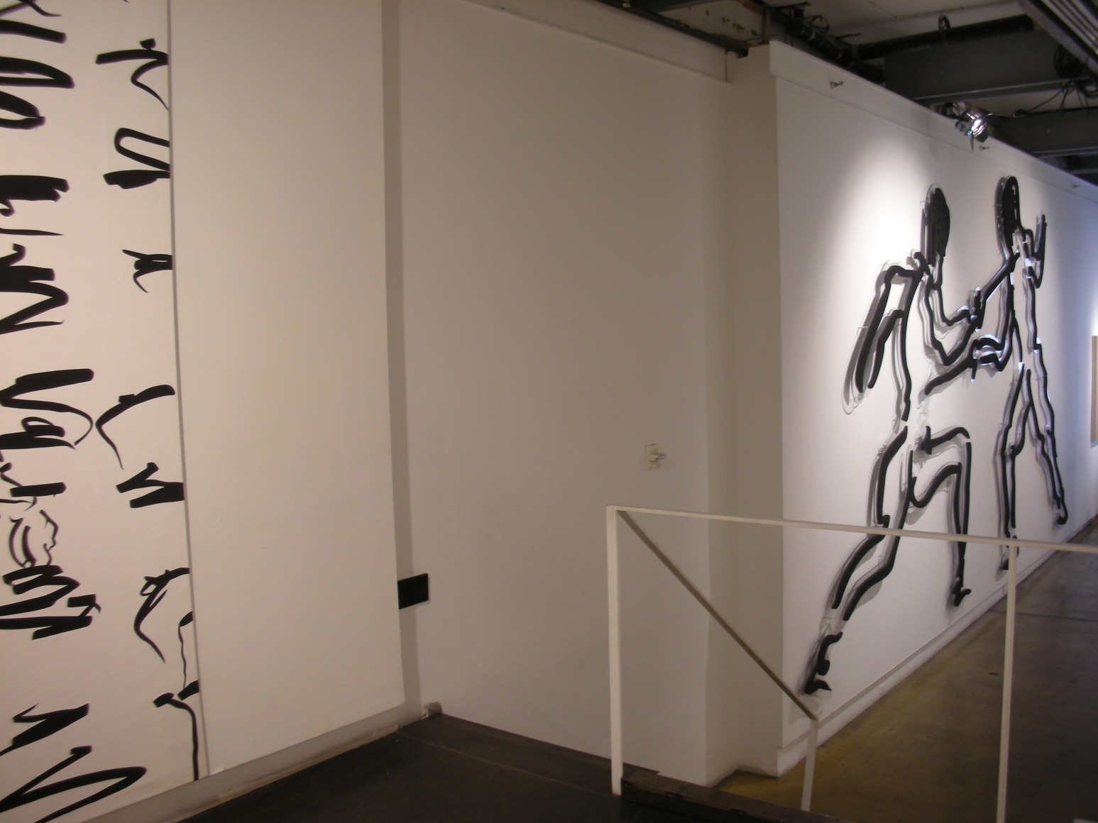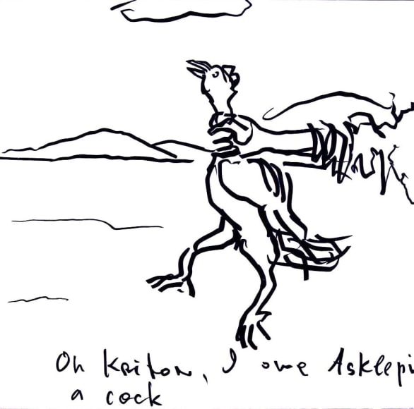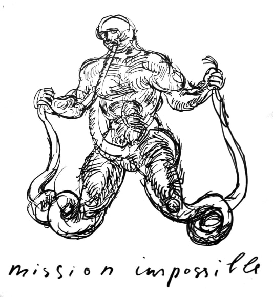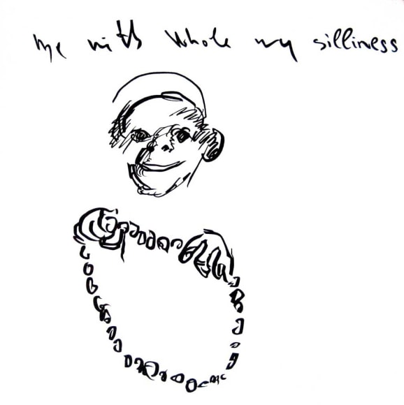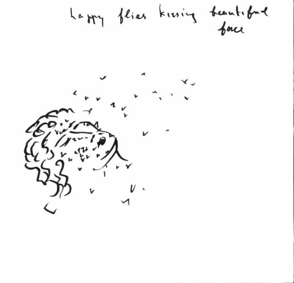 Forming the bulk of the exhibition, on view at STUX Gallery are large-scale paintings the artist created by projecting small hand-drawn sketches on canvases and painstakingly reproducing each enlarged copy. Completing a short circuit between drawing and painting via mechanical reproduction, stylistically the sketches invoke the calligraphy used in Georgian script, while the sparse composition points to the work of the Russian Constructivists or Conceptual art. Often underscored by a fragment of text, these paintings depict objects and figures ranging from the quotidian to the uncanny, each rendered in (a copy of) Edzgveradze’s unique gestural hand. Part of the series, Tina Turner and the Chest Hairs of the Jesus (2005), for example, nominally plays upon two senses of “icon” (holy and pop diva), while adding pencil and confetti to the surface of the canvas.