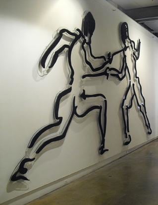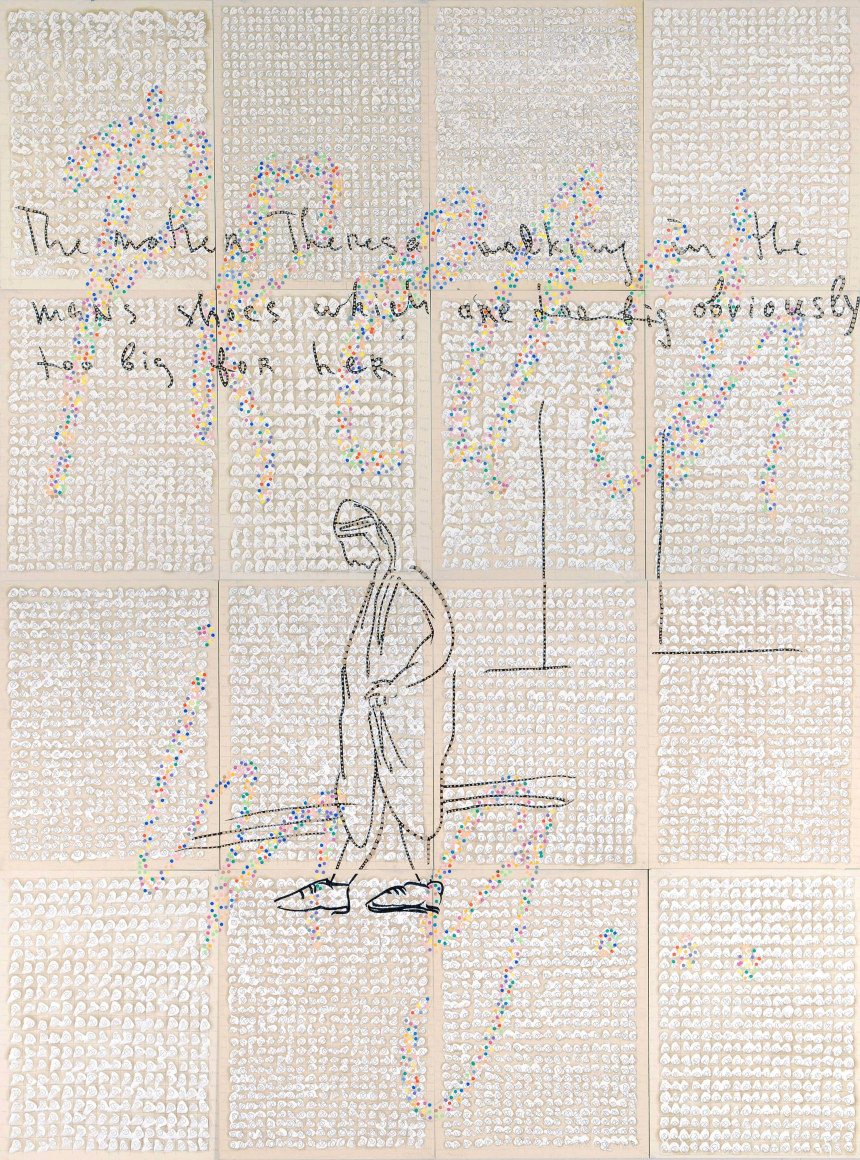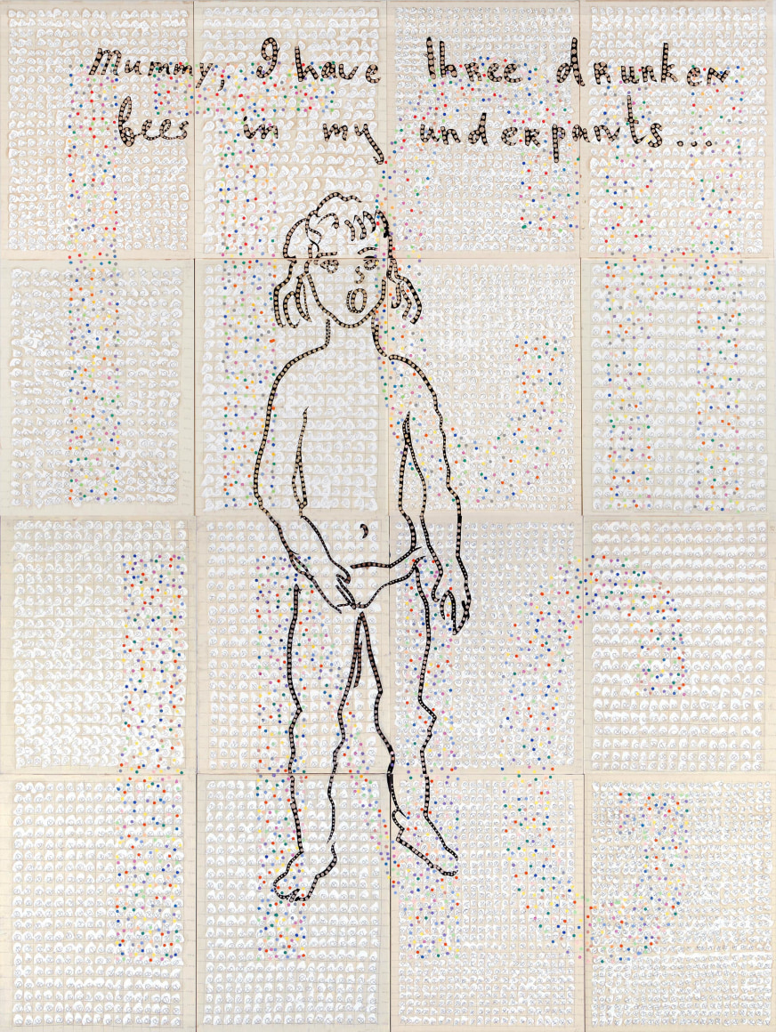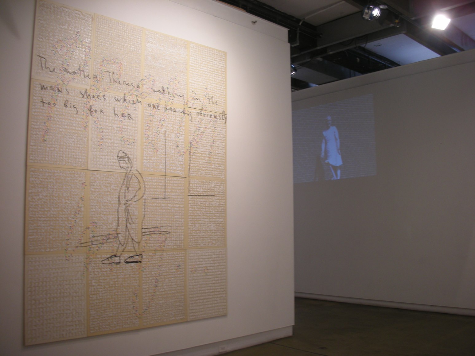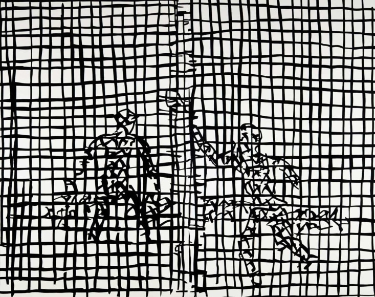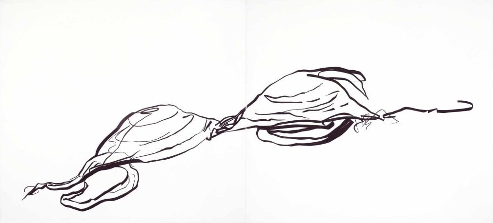 Self-described as representing “the condition when someone is left without a chance to be secure, cozy, protected and is deliberately forced to be naked and de-territorialized”, Edzgveradze’s “The Stolen Blanket and Other Short Stories” combines themes of intimacy and domesticity with publicness and alienation. Part of a series of large-scale paintings, The Big Bra (1990), at over fourteen feet wide, magnifies and makes public the artist’s personal calligraphic sketch of the ordinarily private undergarment.