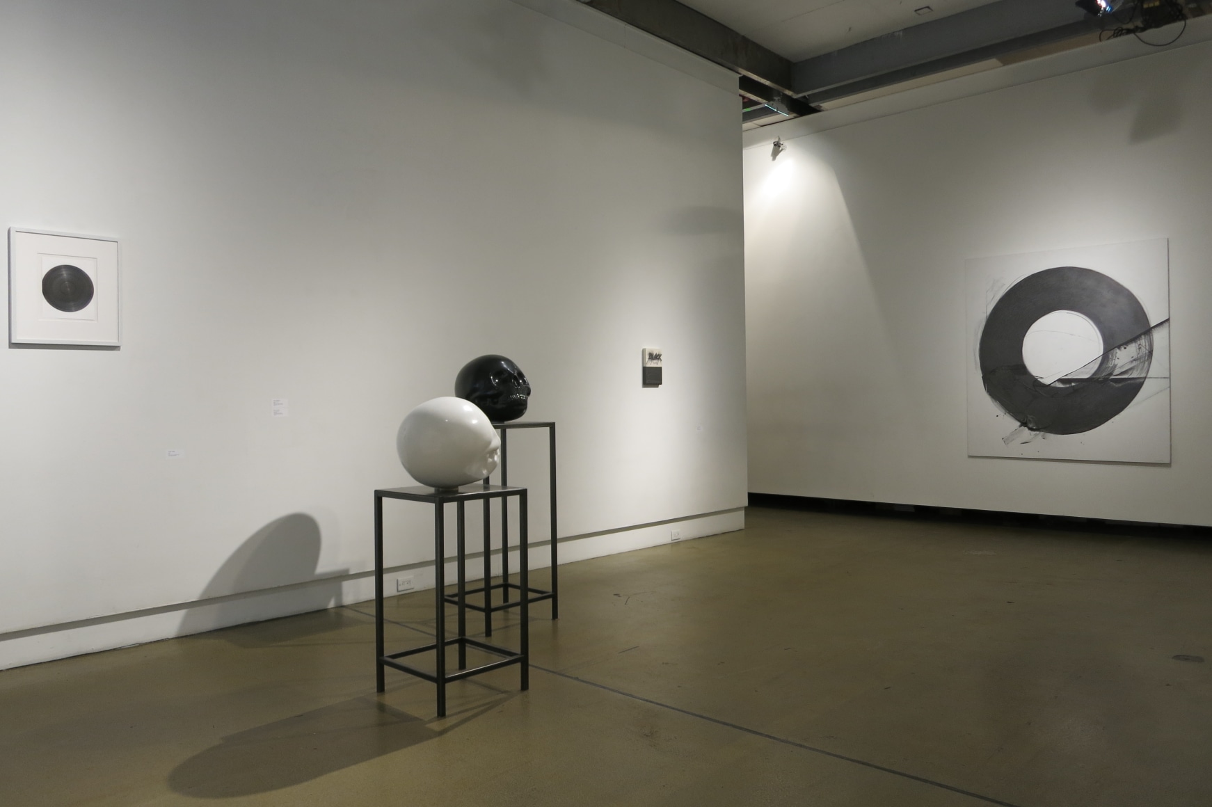 When the luxury of color (and sometimes grey tones) is unavailable, artists are forced to accommodate the raw, schizoid juxtaposition of black and white – a simple binary relationship with light and the most dramatic contrast available to the eye. The sharp clarity marks boundaries and perceptual connotations that simplify artists’ expressive options, compelling them to - as seen in the paintings of Matsutani, Busby and Tambellini - mobilize texture, materiality, and composition to orchestrate visual impact and awaken palettes in our imagination. Minchev elucidates the gap between perception and pre-existing understanding in his black "Blown Skull", and once again in a ghastly white incarnation. The absence of tonal nuances triggers a sense of devastation and urgency that subsequently results in refined negotiations for ambiguity and narrative control. “Shades”, writes Alexander Pope, “sweetly recommend the light”, and the sunless blackness that enshrouds Nancy Spero’s black painting emanates a sparse, ardent luminosity.
