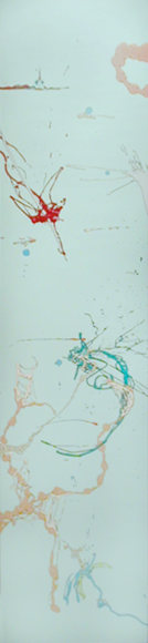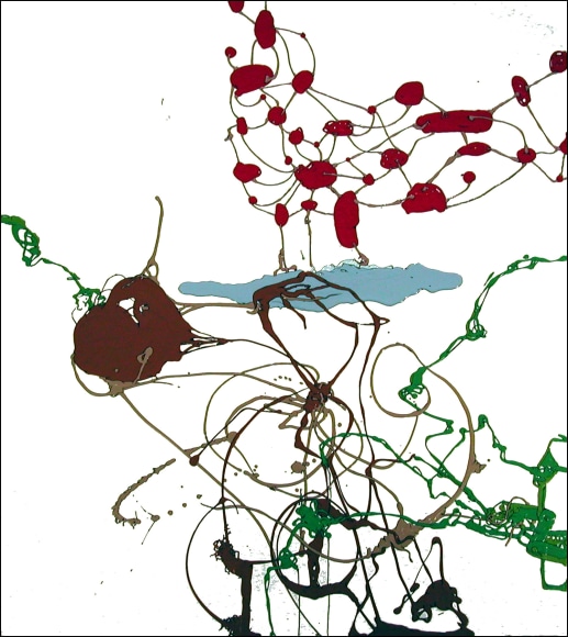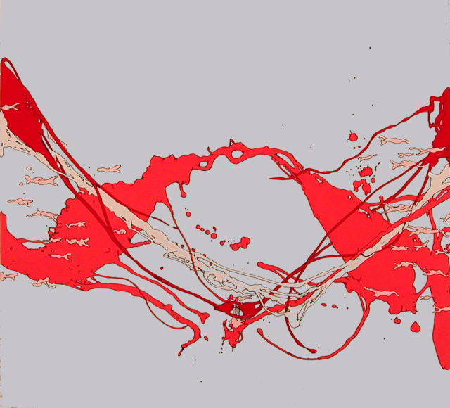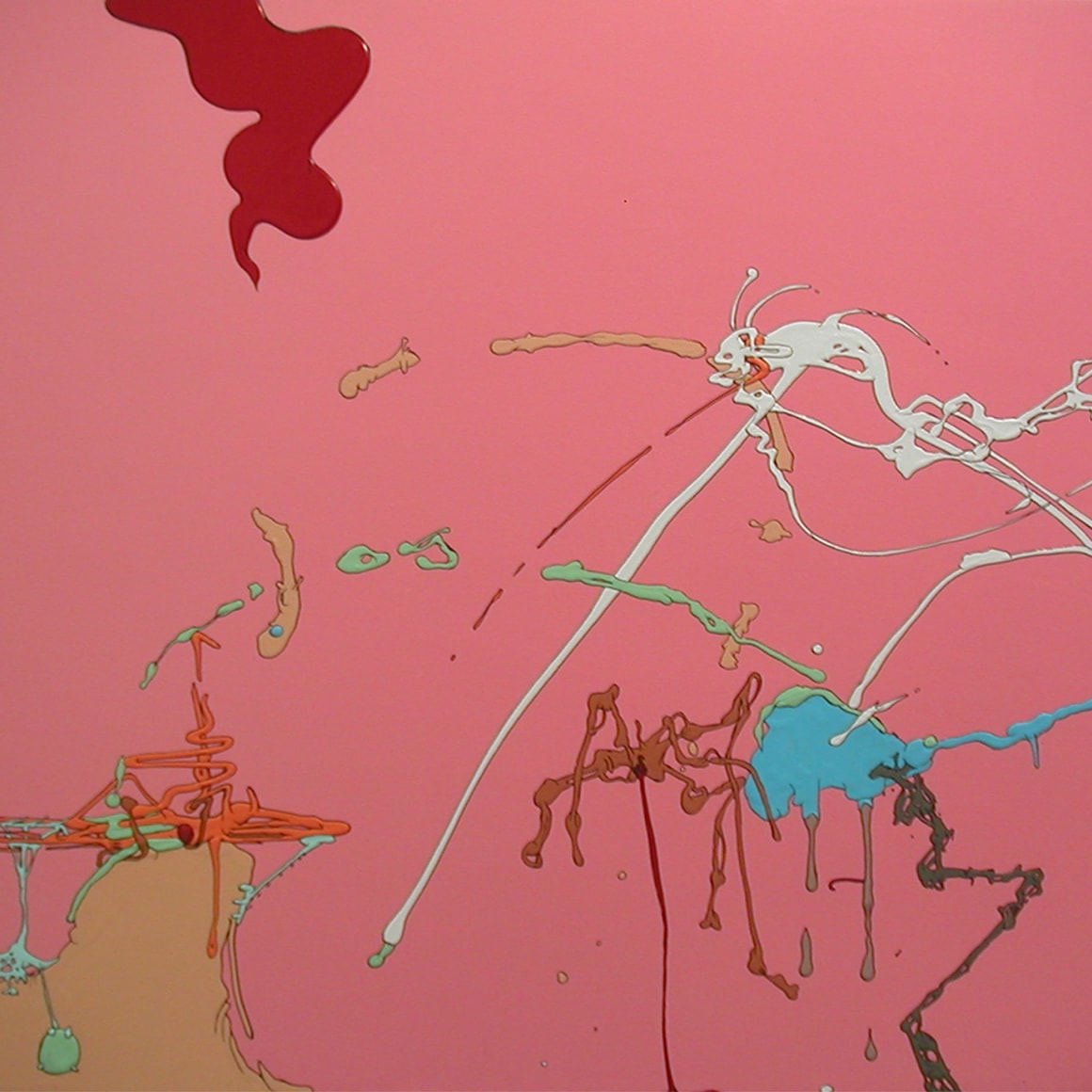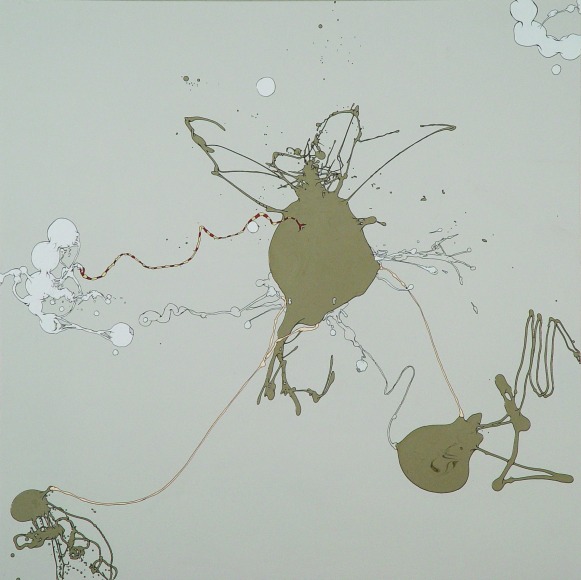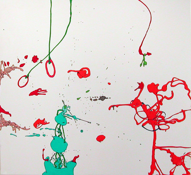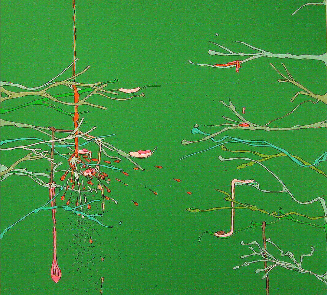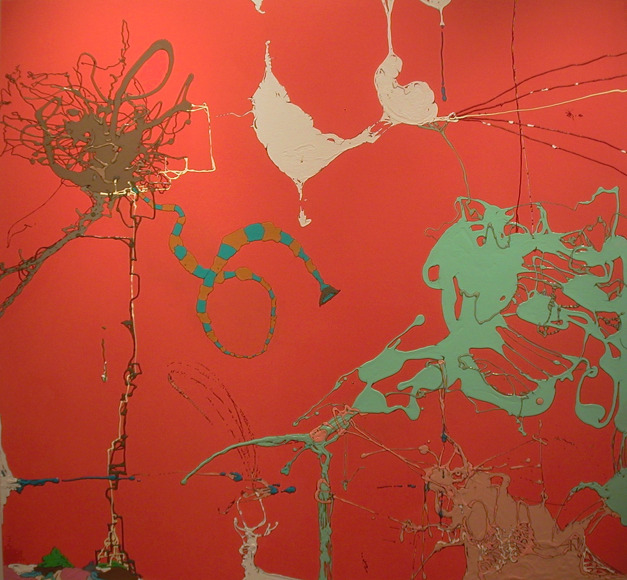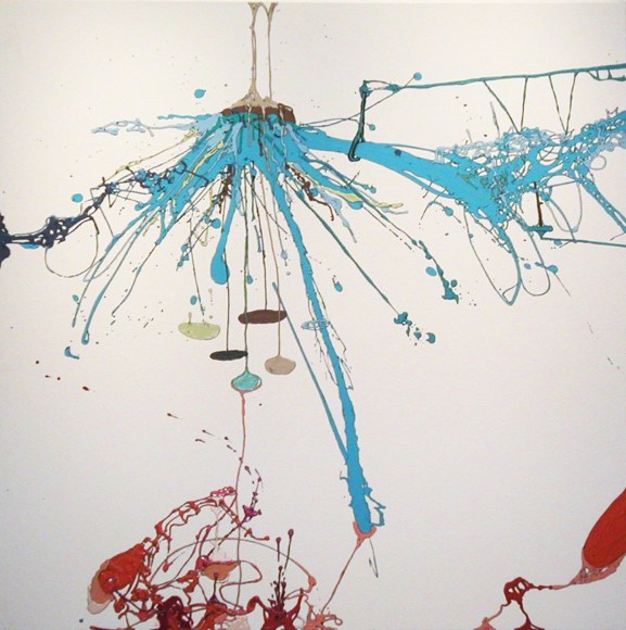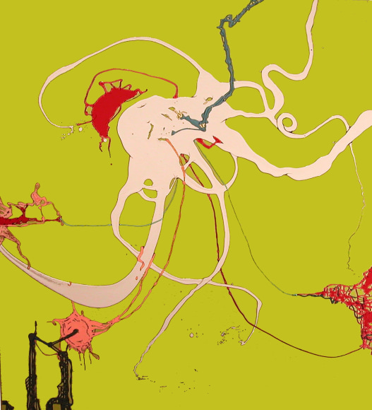 Trepanier begins by pouring irregular threads of acrylic enamel paint onto the surface of a canvas, which has already been given a smooth, enameled ground. The improvisational gobs/strands of paint are given plenty of breathing space in these new works and often drift (or seem pulled) toward the edges of the canvas, leaving large areas of charged negative space where the seamlessly flat, but saturated, color of the base field presses forward through the gap. She then carefully outlines the biomorphically abstract blobs of dripped paint with darker shades of color and/or black, transforming the drips into unexpected, tangled organic forms – a gnarled tree root here, an expressive bit of attenuated viscera there – which call forth an endless range of references (and their attendant emotional responses) from the viewer, relying on something akin to the suggestive effects of the Surrealists’ psychic automatism.