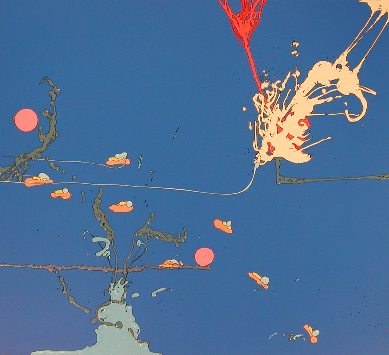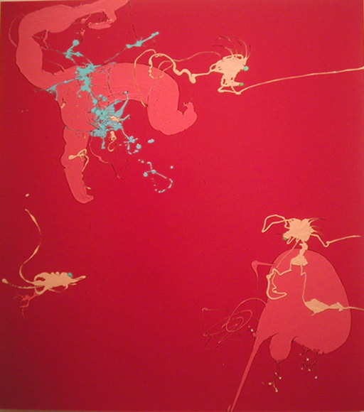 Using bright candy colors throughout, the outlined forms gain a vigorous graphic “snap,” an effect intensified by the overall smoothness of the painting’s surface. Trepanier brilliantly directs the apparent movement of her abstract forms as they slide across the picture plane, envisioning them as though they were actors in a film. The blobs reach out toward other forms, shrink away in fear, fight, or otherwise engage each other on the slick surface of the screen/canvas. This cinematic, freeze-frame effect heightens and intensifies the sharpened graphic qualities of the image, presenting the viewer with a bizarre, seemingly recognizable scenario, but one which perpetually frustrates any attempt at a fixed reading due to its fundamentally nonobjective nature. The result is a series of purely abstract works that nevertheless provoke a deep, often disturbing response in the viewer as they surreptitiously burrow into the psyche through the crucially charged avenue of vision itself.