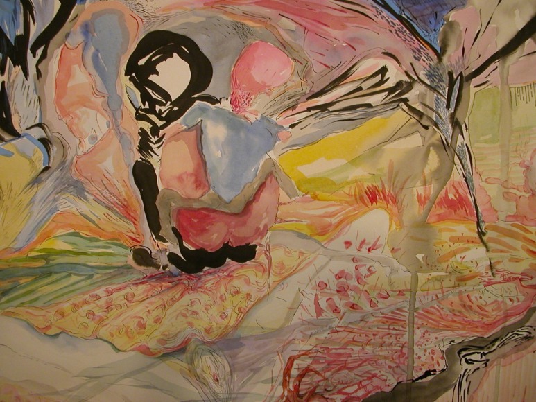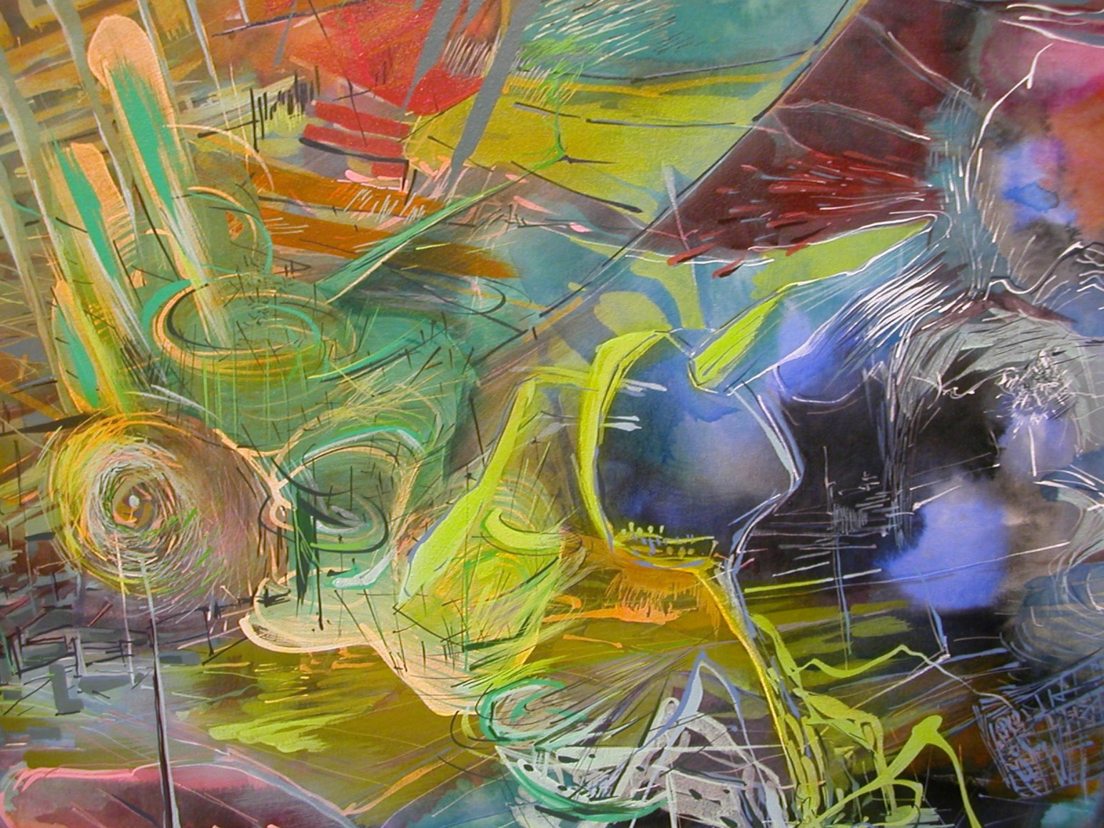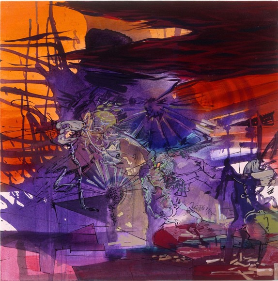 There is a great deal of movement within these paintings as swirling “winds” wreak havoc upon unsuspecting figures that are seemingly unaware and unsure of their fate. Within the paintings Gueorguieva evokes the otherworldly alongside of the familiar - landscapes, suns, moons, cityscapes, abstract forms, and organic and surreal references of nature. The paintings evoke a three dimensional space created by the artist's multiple overlapping of imagery and her more personal calligraphic markings.