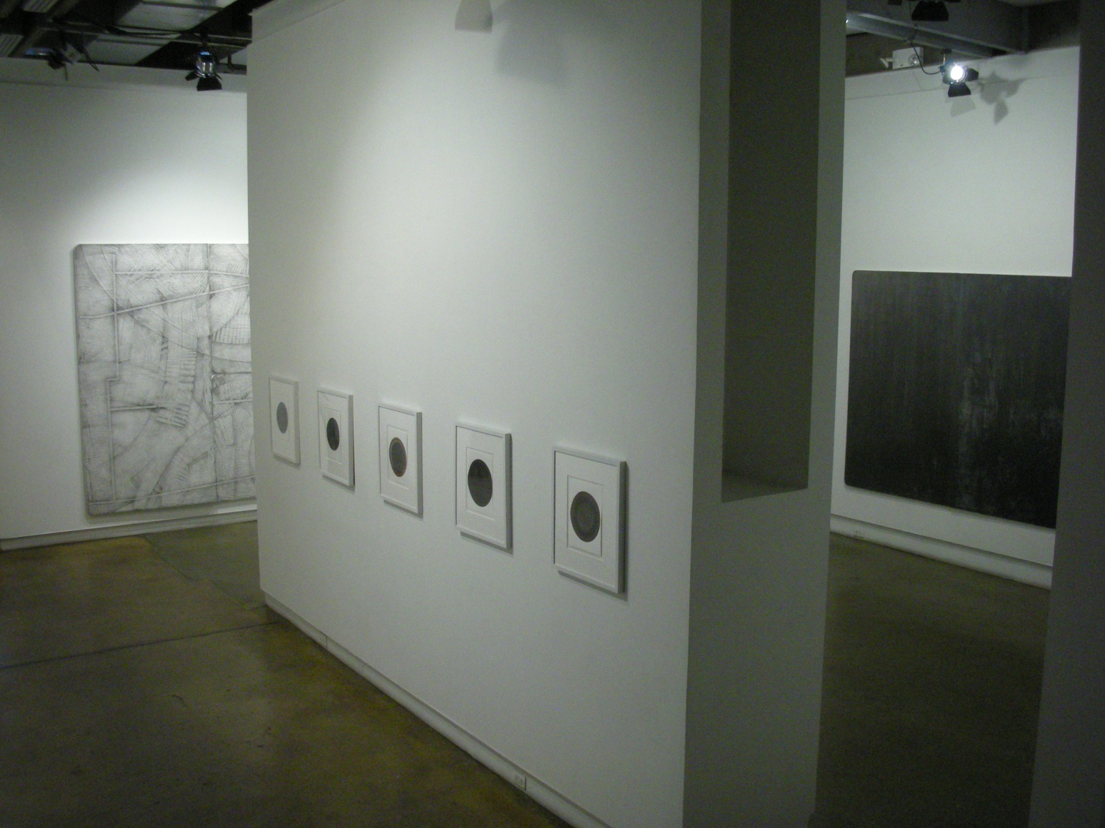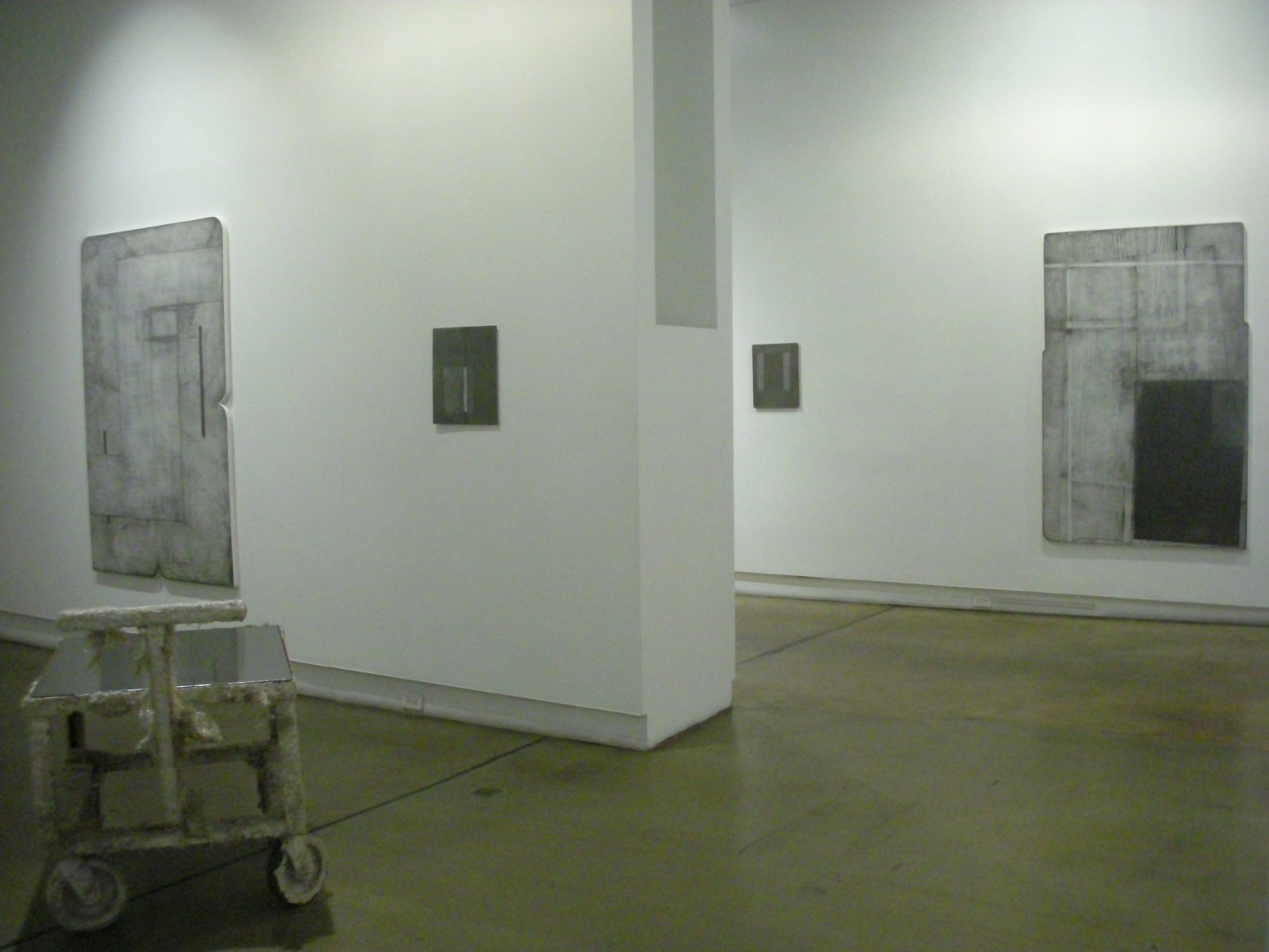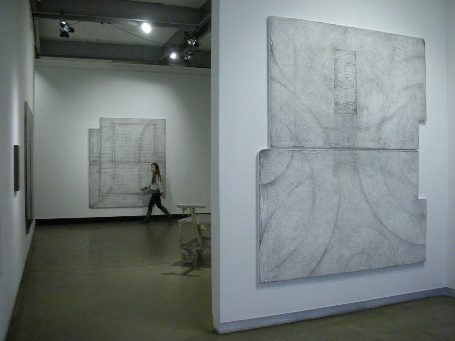 The effects of Busby’s obsessive attention to surface texture and geometric relations are magnified in his new works of unprecedentedly large scale, for the artist. Created by sanding thick layers of gesso, his already low reliefs become vanishingly subtle amidst the enlarged overall dimensions. However, up close the viewer will discover forms that hover above or sink below one another in their new spacious habitat, creating frictions and spatial tensions that echo beyond the visual field. Oddly, the compounded complexity renders his works even more intimate as Busby’s trademark techniques dazzle in in their expanded venue.