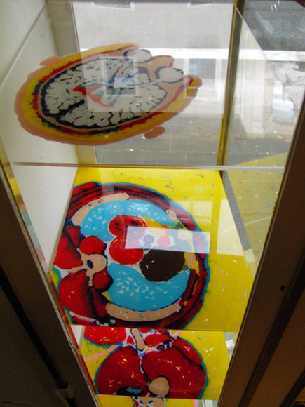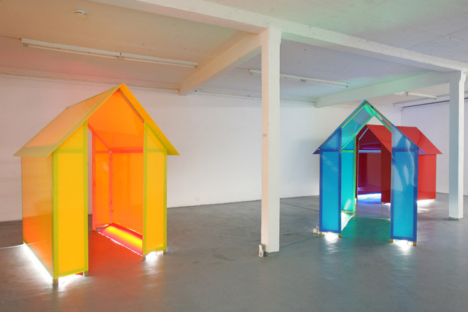 Zehrer’s human life-sized Plexiglas houses in transparent, red and yellow form an abstract road zigzagging through the gallery. Connected with each other by movement detectors that cause the illumination of the houses when one moves around or walks though them, they allow the visitor to experience a special form of interaction with the artist’s work.