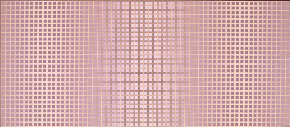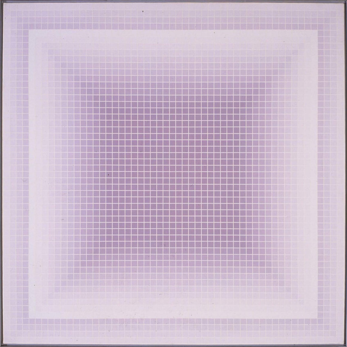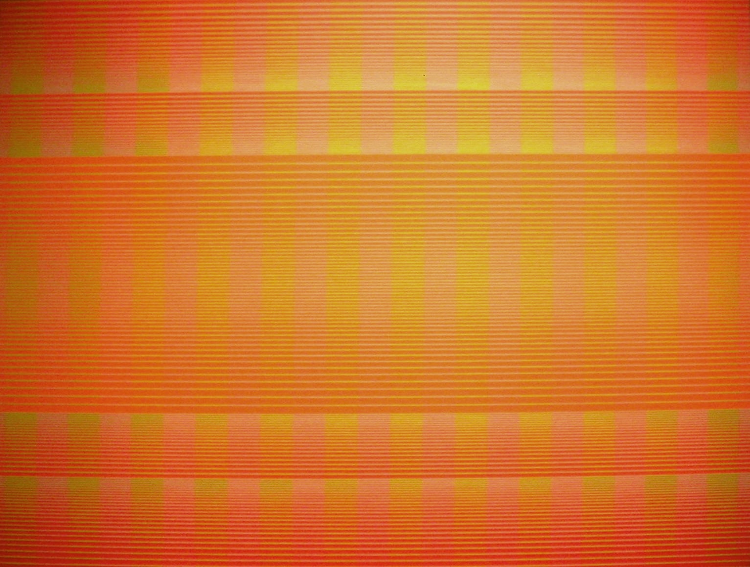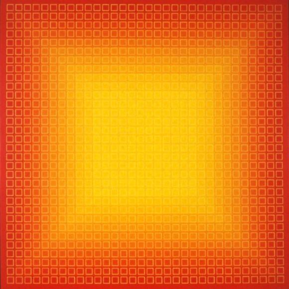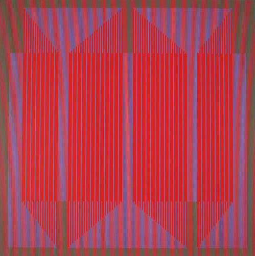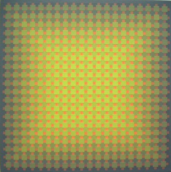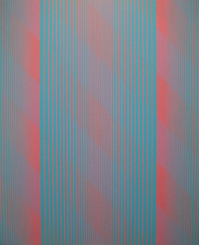 Developing his interest in visually powerful, complex color relationships, Stanczak’s paintings have focused on a wide variety of forms, ranging from grids, repeated rectangles and other geometric forms, to arcs, curves, and even biomorphic contours. His intense concentration on color shifts and visual perception led him in a number of works to create the impression of line (although line itself does not exist) through abrupt shifts of hue and/or value. In a work like The Duel (1962/63), what initially appears to be a field of narrow vertical stripes is ingeniously disrupted to create a series of irregular, floating horizontal forms. The contours that define these shapes are in fact formed by the viewer’s perceptual apparatus, and not by any explicit line defining them. The implied becomes actual, even as the means to achieve this result are suppressed. This little miracle of vision – the way that our minds provide “missing” information as we encounter the visual world – is a phenomenon initially recognized and exploited by artists such as Seurat and Cezanne. (It also happens to be the key insight behind the development of the motion picture.)