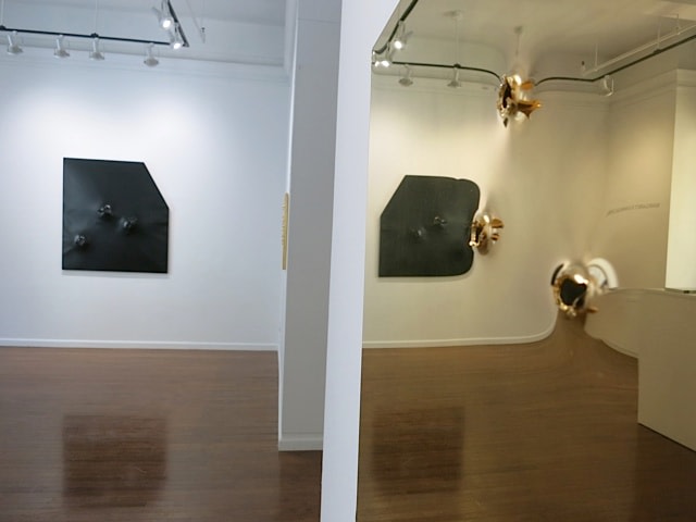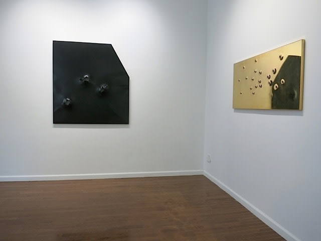The works in An Injured Armory propel Evangelineʼs aesthetic into new realms by examining chromatic possibilities of a rich and smooth matte black finish and an iridescent white, applied to her usually bare stainless steel shot “canvasses”. The 5-sided black and white wall works have an unexpected physical interaction with the usual 4-sided canvases because of their sculpturally missing corner. These new shapes, along with the play of light and shadow in these coatings, create a look and feel that is familiar yet brutally alien.