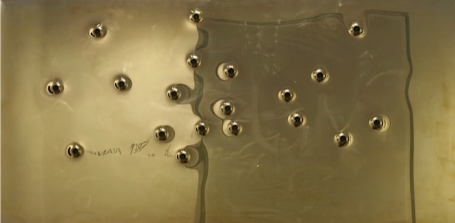 Uncanny Guest, 2013, gunshot on stainless steel plated with 24K gold, 23 x 40 in (59 x 102 cm)