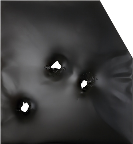 Sunday Morning I, 2015, gunshot on powder-coated stainless steel, 50 x 46 in (127 x 116 cm)