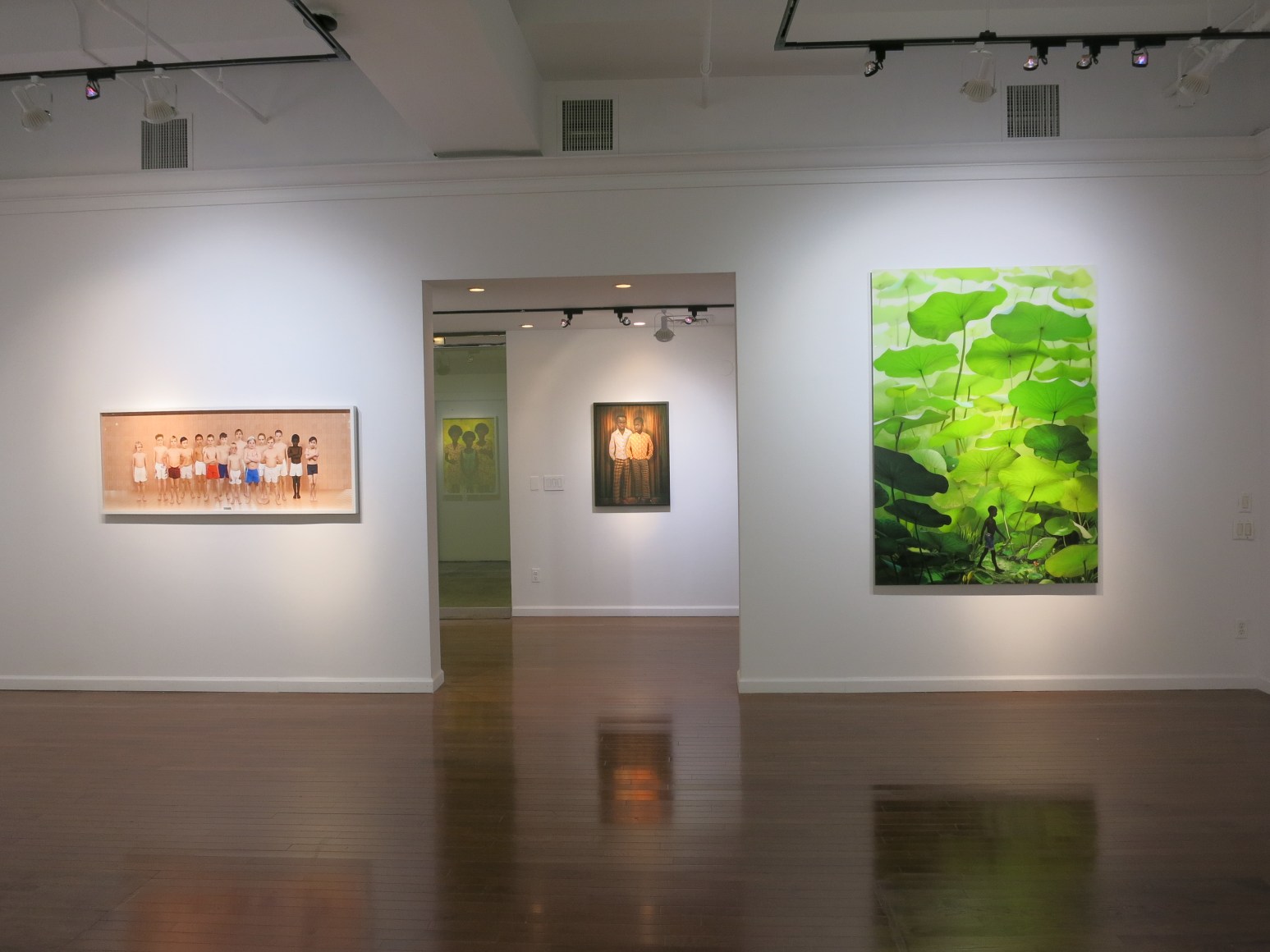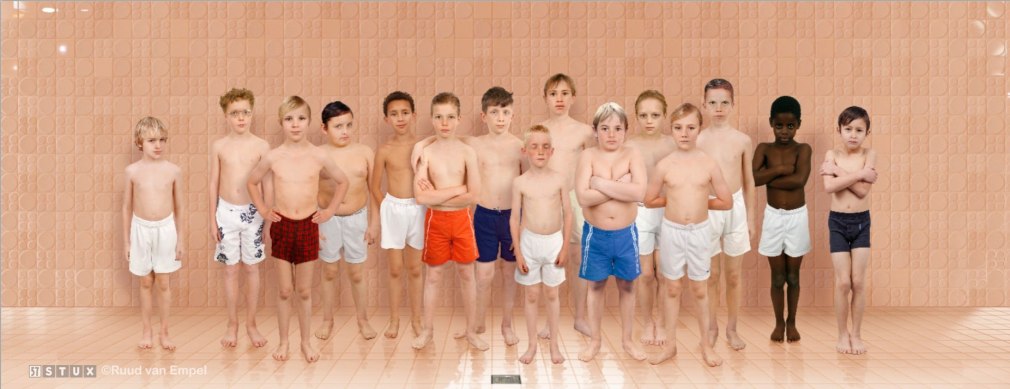 In his new panorama, Club, van Empelʼs composite of young boys in varying stages of adolescence are grouped together, prepared for a swim class. In a departure from his usual lush and ethereal landscapes, the background is reduced to the cold and shiny sterility of tiles. Juxtaposed against the minimal setting and dressed in only their bathing suits, the boys manifest their individuality, accented by variations of pose, facial expression, and clothing. Since each face is a compilation of many other faces, each child is equally and simultaneously real and fictive, elevating the work to a universallevel. Most importantly, Club, as well as another work titled Hero, speaks to a collective memory on the struggles of adolescence in which the subjects are engaged in the formation of their identities individually as well as in relation to one another.