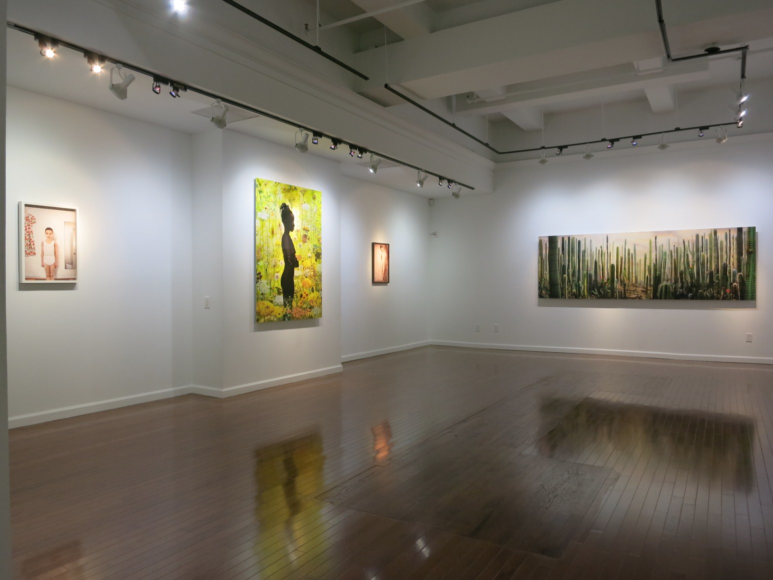 In his newest works Identity #1, Identity #2, Identity #3, Perception, Boy, Atmosphere, Figure, Promise, and Nude #4, van Empel continues to focus on the subject of children. In the eponymously titled Identity #2, the figures of three girls emerge from a romantically lush and wooded landscape appearing as though from another time period, a reflection of the viewerʼs own childhood reminiscences. Van Empel is able to show the viewer an idealized and transfigured image of beauty in a hermetically sealed environment. Interpretation of the subjects and their passive, almost perfect, smooth appearances can be ambiguous: they can become a personification of innocence and simplicity or they can appear as if in judgment of the viewer. The formal clothing of the subjects contrasts with the natural setting; the girls are dressed in their pristine Sunday best. However, the floral pattern of their clothing speaks to an underlying theme of synthetics. The girls themselves are a composite of many other images while their clothing is an artificial extension of the Amazonian background.