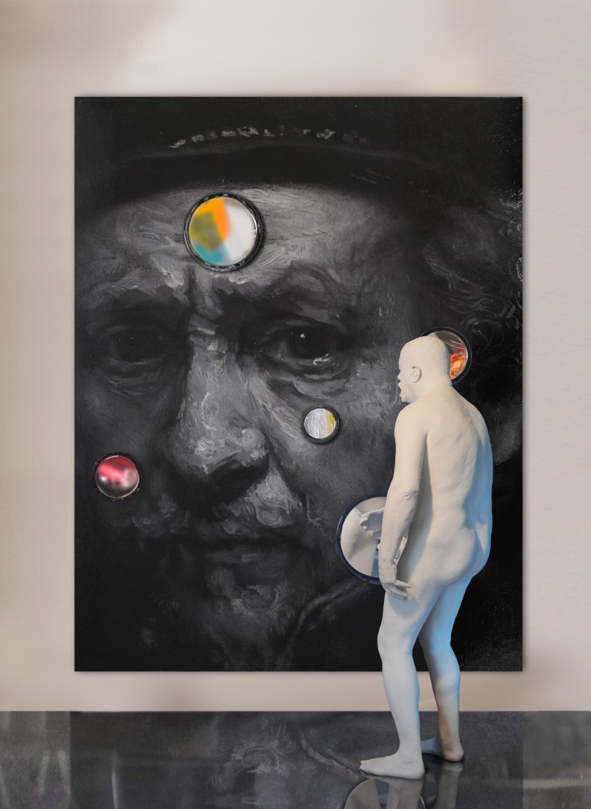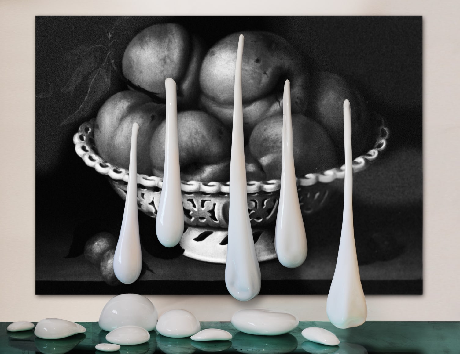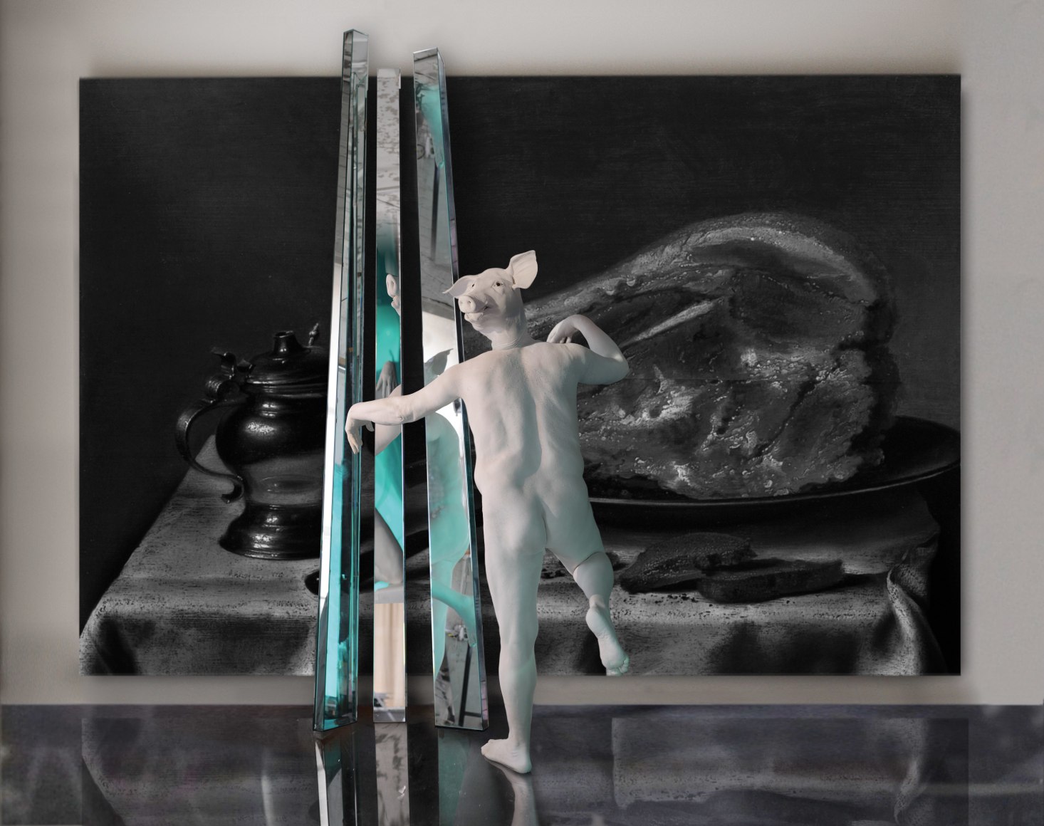 In these massively scaled works, Okshteyn sustains a heightened involvement with reflective surfaces, such as glass and mirror, to suggest a dynamically invasive sense of self-monitoring, as well as the enlargement, distortion and splintering of the self under pressure. The artist expands upon his signature mimetic representations of Old Master paintings as well as objects culled from every day life to suggest specific moments in time, invoking disorientating tableaus from which a myriad of possible narratives emerge.