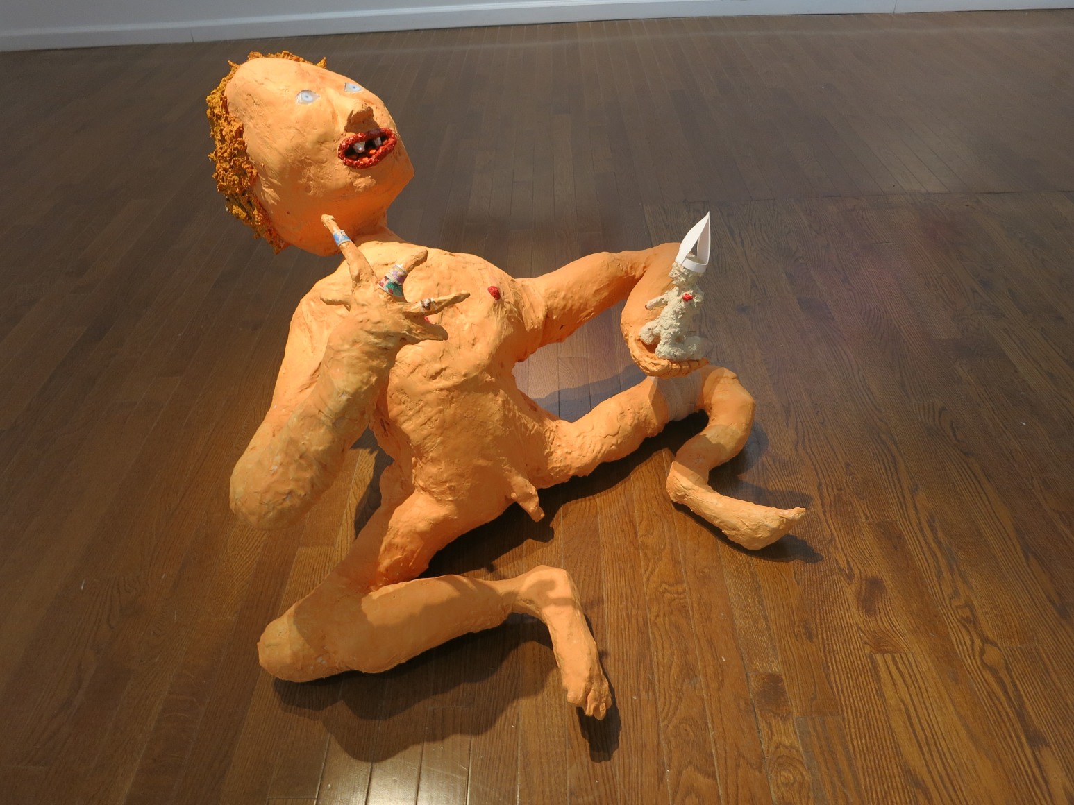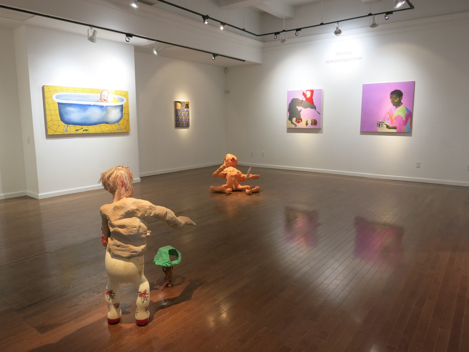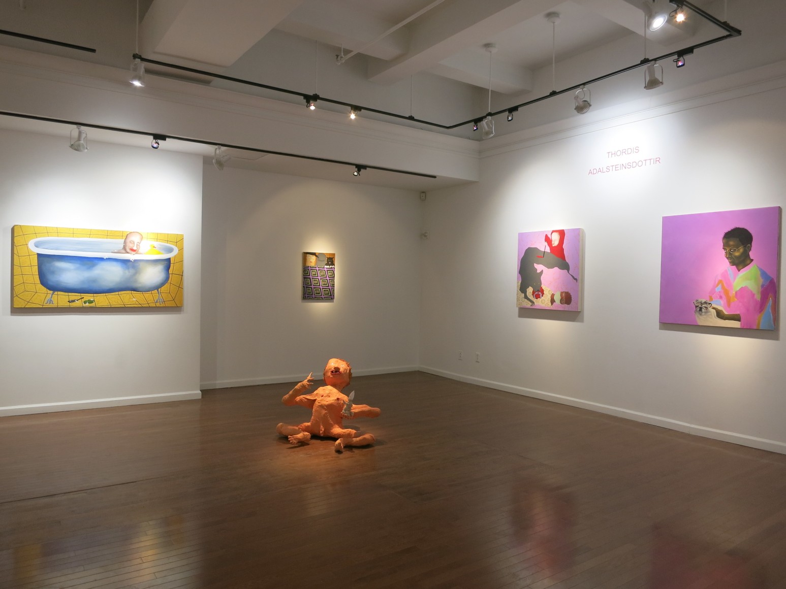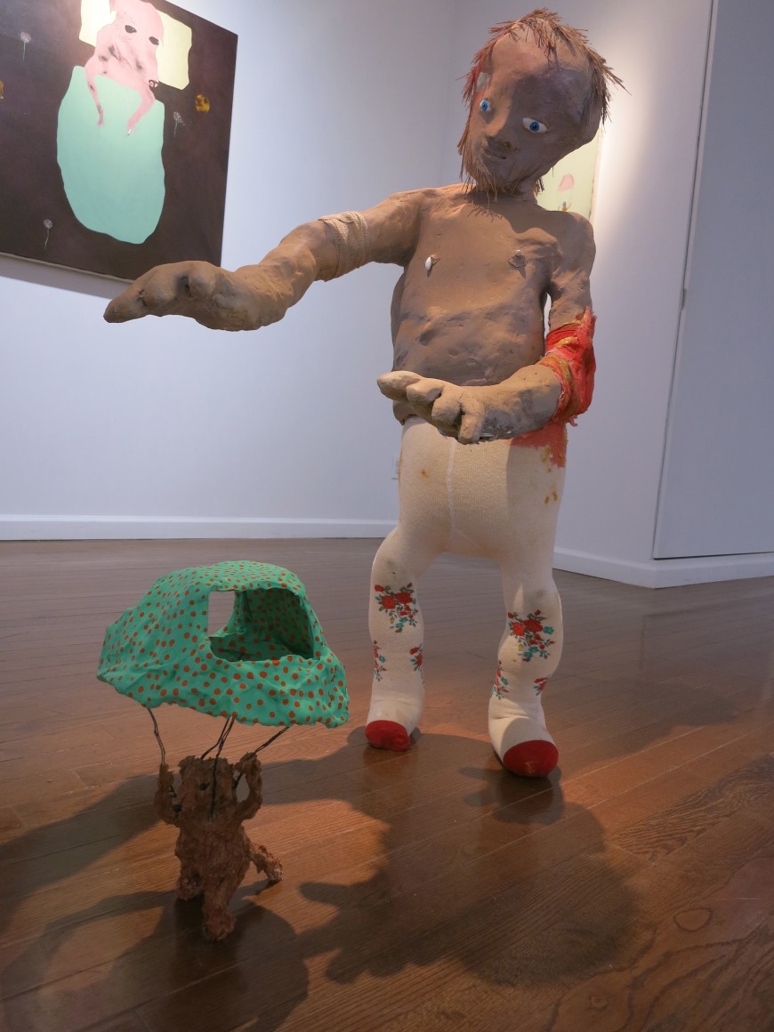 The sculptures in this exhibition highlight Thordisʼ ability to conjure a playful, yet simultaneously savage, alternate reality. A man with giant hands and vacant eyes looms over a tiny creature clinging to its parachute improvised from polka-dot underpants. Both man and creature are presented in a crude, childish style that recalls Dubuffet, achieving a sort of 21st century surrealist art brut.