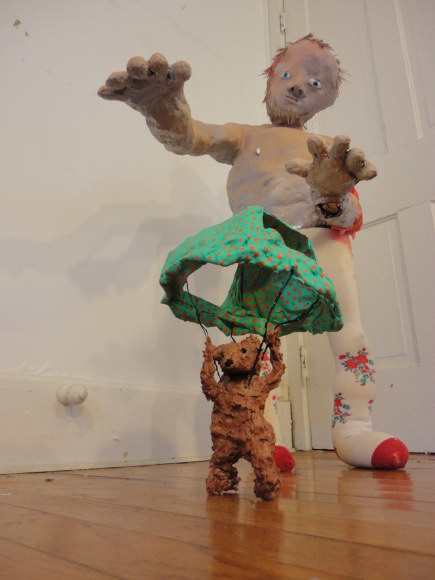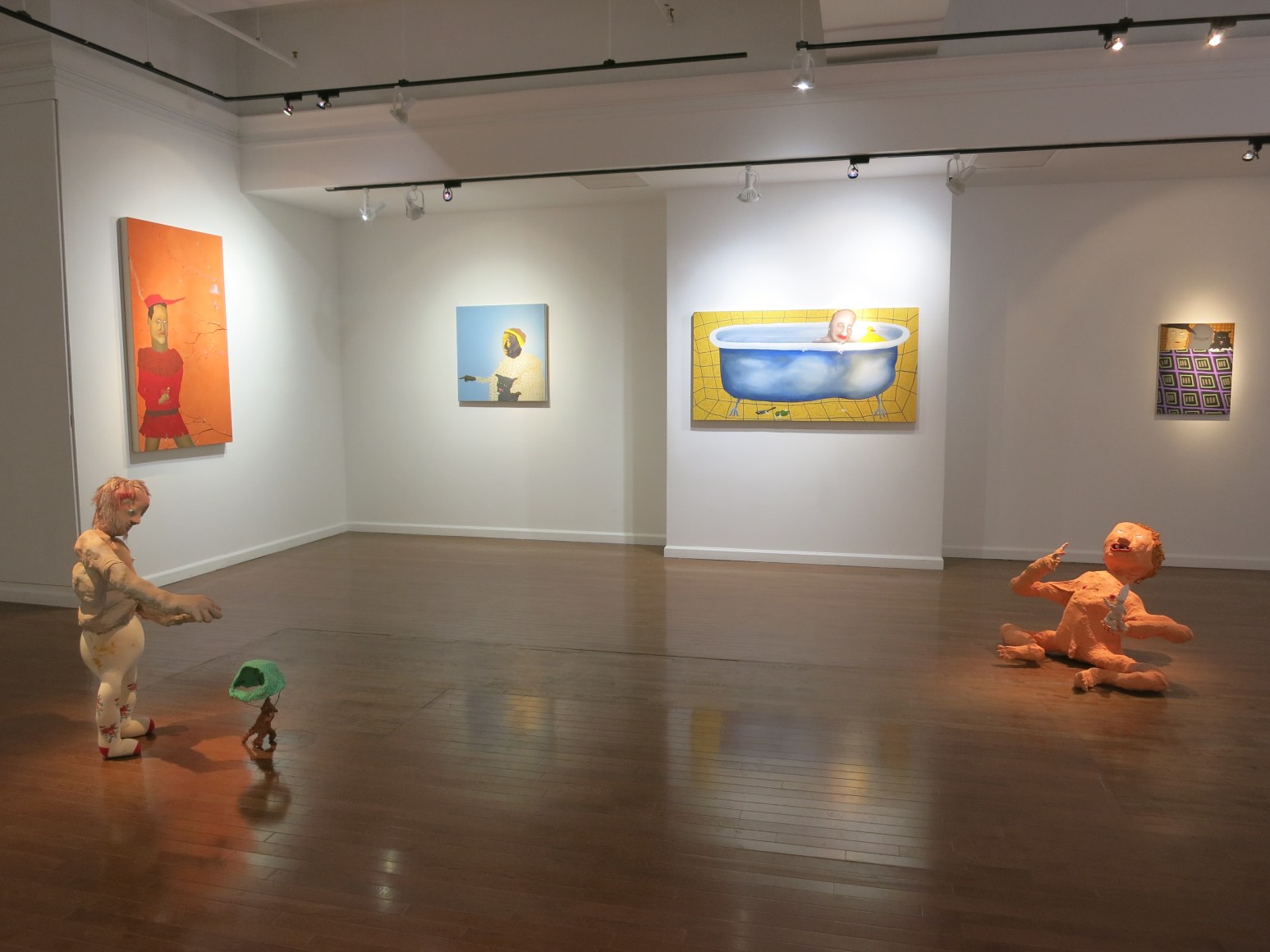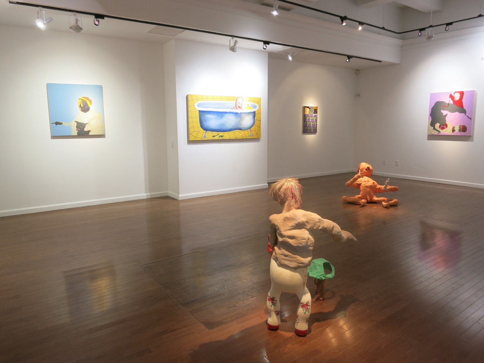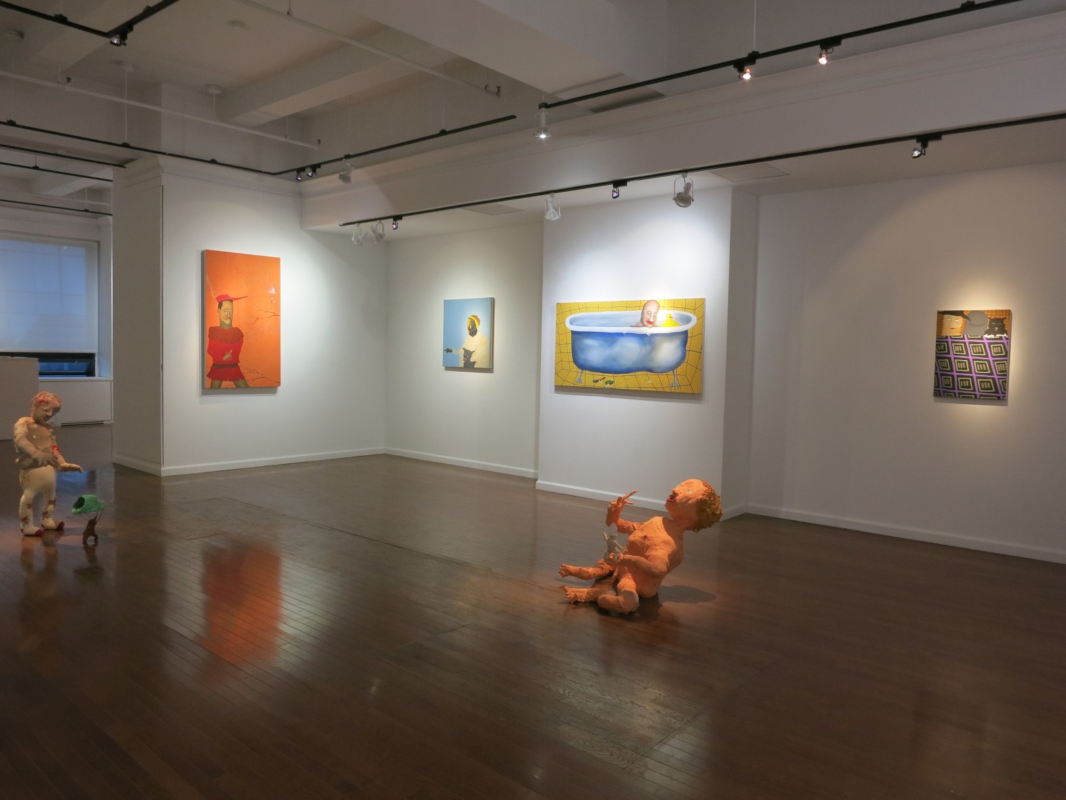 The sculptures in this exhibition highlight Thordisʼ ability to conjure a playful, yet simultaneously savage, alternate reality. A man with giant hands and vacant eyes looms over a tiny creature clinging to its parachute improvised from polka-dot underpants. Both man and creature are presented in a crude, childish style that recalls Dubuffet, achieving a sort of 21st century surrealist art brut.