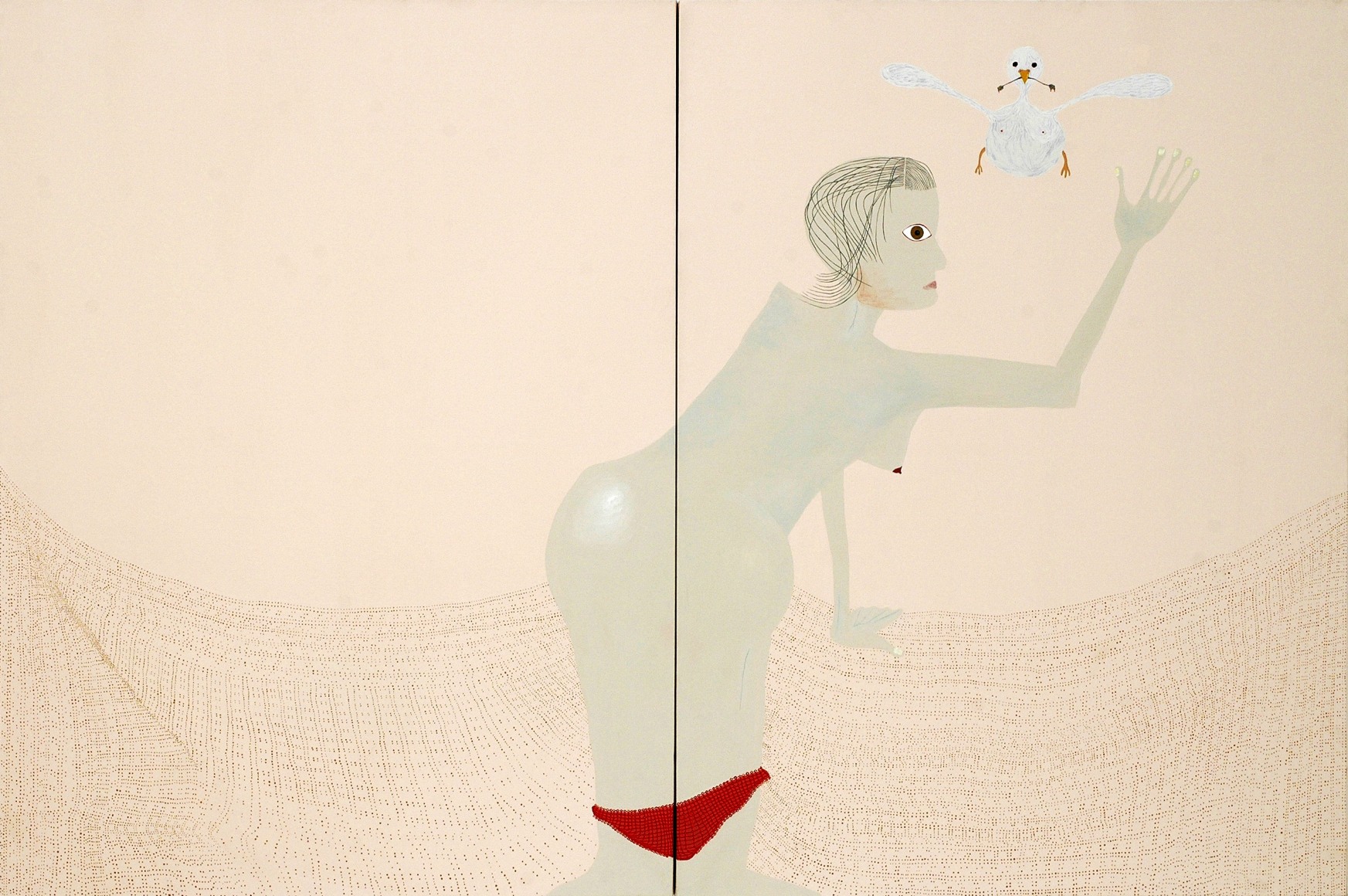 diptych Woman and Bird with Ovaries (2004) she has created a narrative in which we are