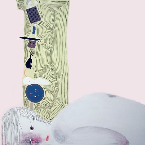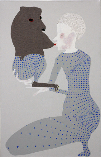 Thordis Adalsteinsdottir creates her paintings in response to how conflicts, sometimes political, affect her personal state of being. Strong fields of color abut a sometimes heavily patterned, borderline decorative style of painting to represent hair, textiles, skin, and other organic pieces that are manifest in the works. The paintings create a charged negative space against large fields of color and pattern while conveying a wide range of emotional states of being, from painful loneliness and introspection to whimsy, eroticism and even bliss. Figures with elegantly elongated limbs and torsos embrace and conjure seemingly wild beasts that are, in reality, merely designer accessories such as the pug and the miniature pig.